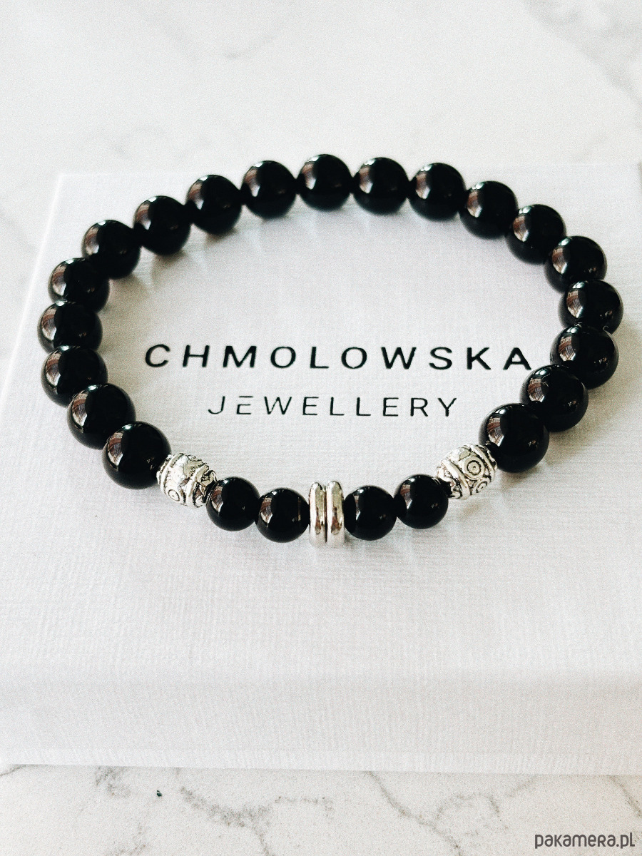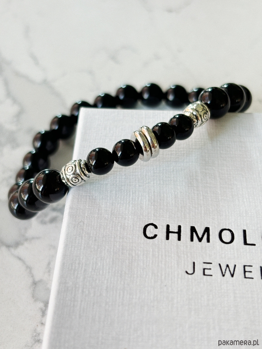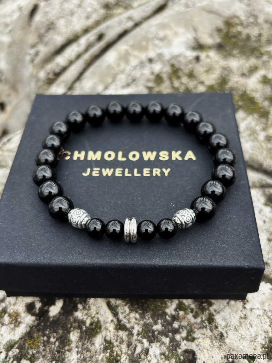 Bransoletka wykonana jest na gumce jubilerskiej z użyciem kamieni onyks oraz ozdobnych przekładek.