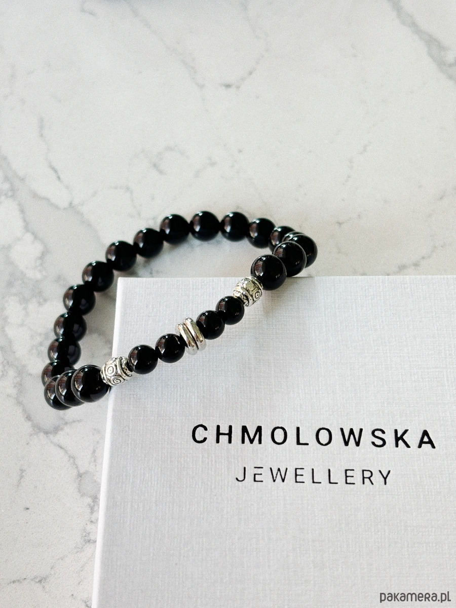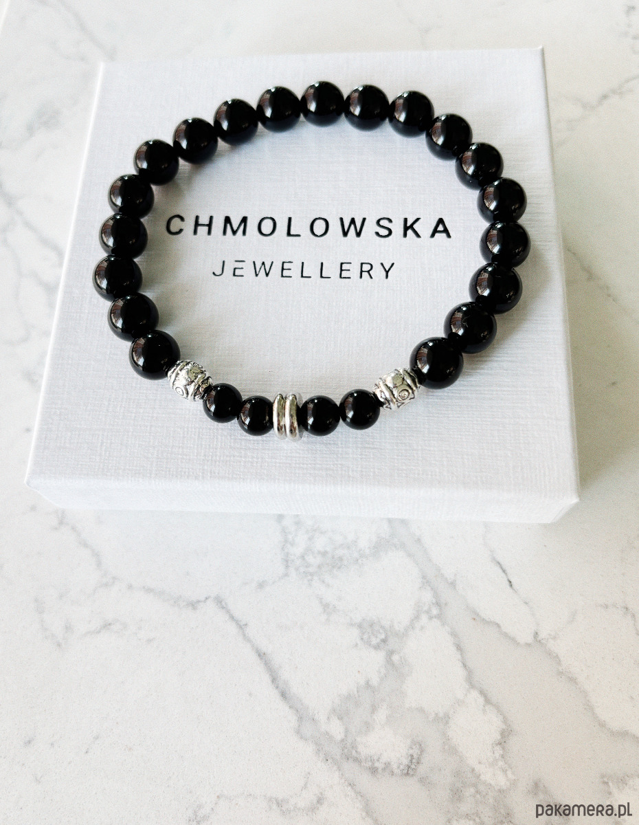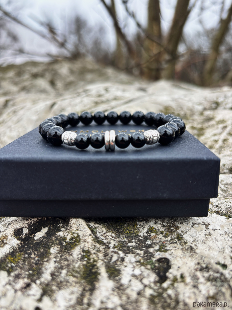 Bransoletka wykonana jest na gumce jubilerskiej z użyciem kamieni onyks oraz ozdobnych przekładek.