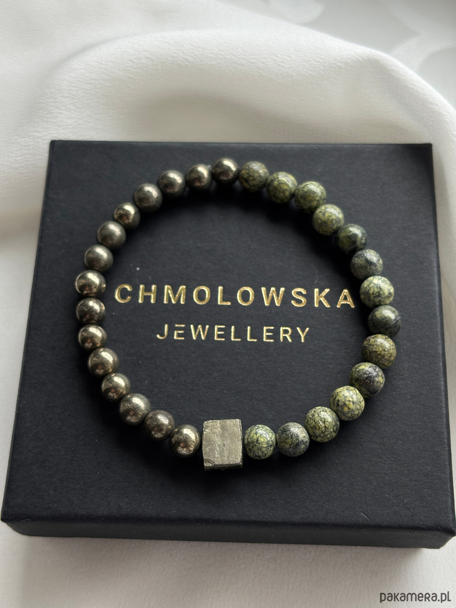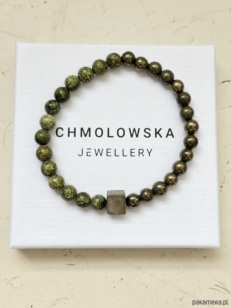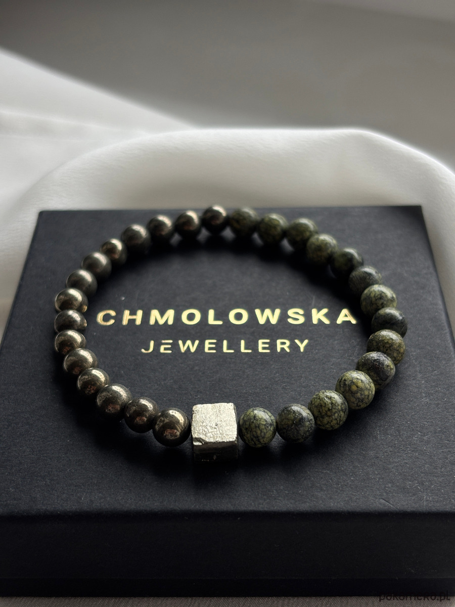 Bransoletka wykonana jest na gumce jubilerskiej z serpentynitu, pirytu w postaci kuli i bryły.
