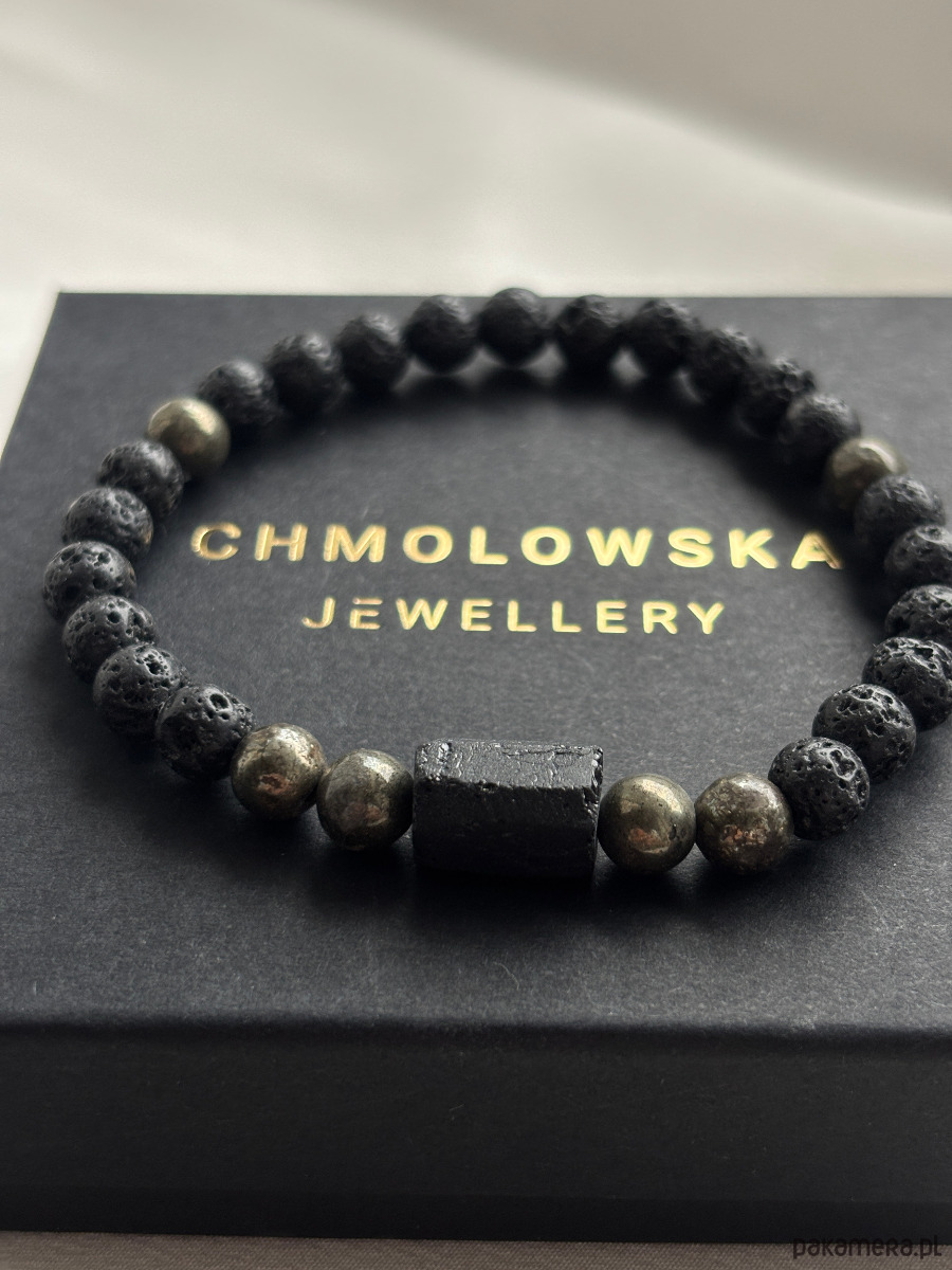 Bransoletka wykonana jest na gumce jubilerskiej z użyciem lawy, turmalinu i pirytu.
