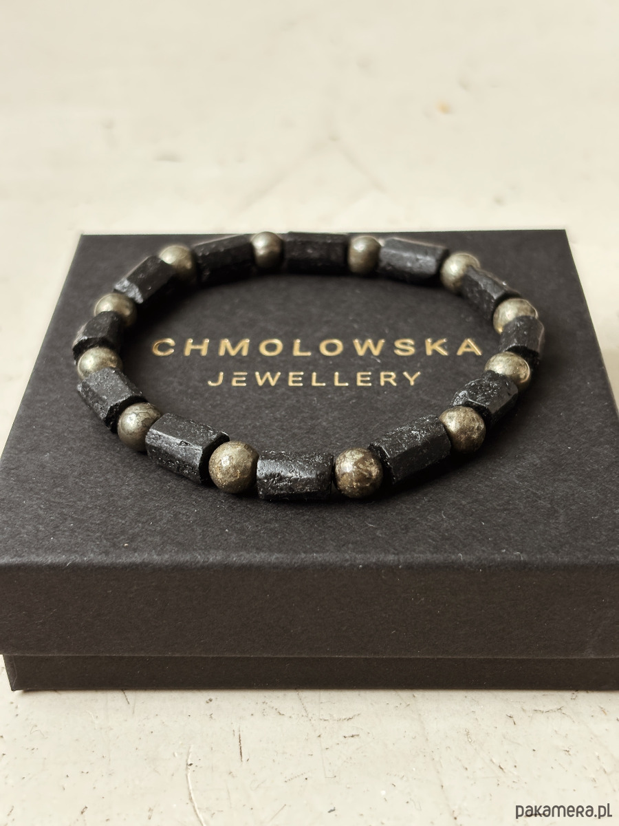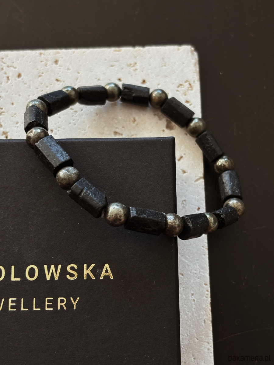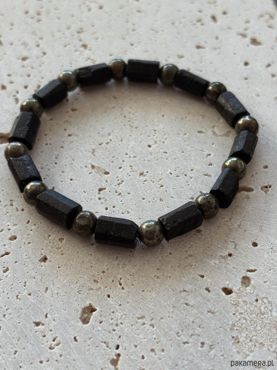 Bransoletka wykonana jest na gumce elastycznej z kamieni Turmalinu czarnego i Pirytu.