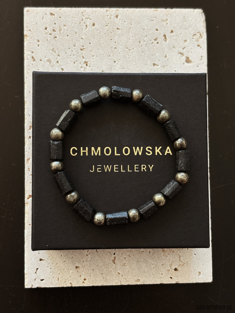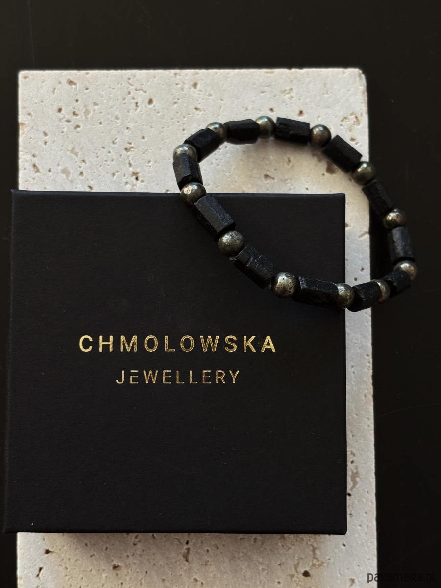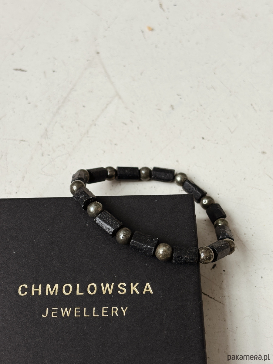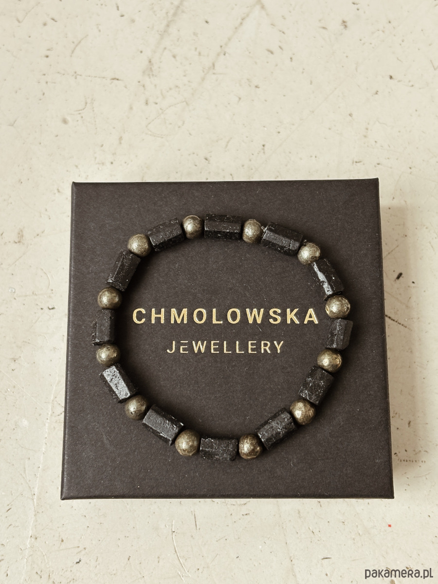 Bransoletka wykonana jest na gumce elastycznej z kamieni Turmalinu czarnego i Pirytu.