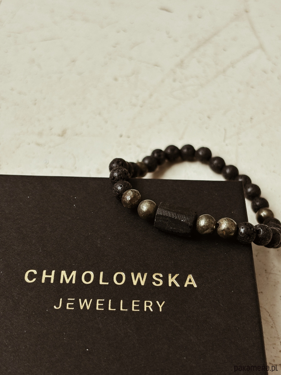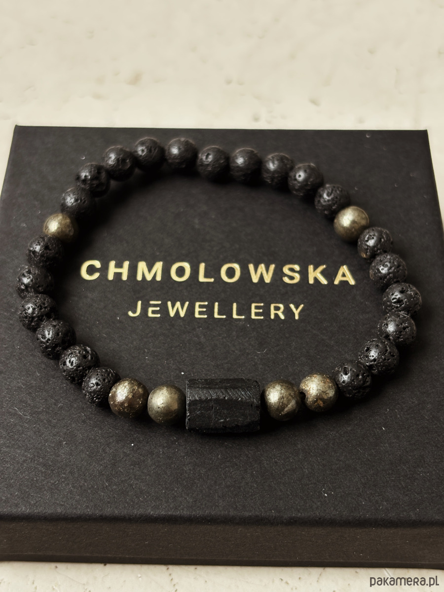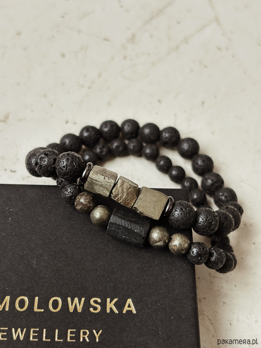 Bransoletka wykonana jest na gumce jubilerskiej z kamieni Lawy Wulkanicznej, Pirytu i Turmalinu.