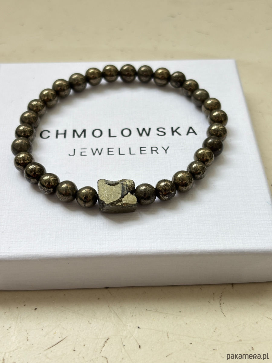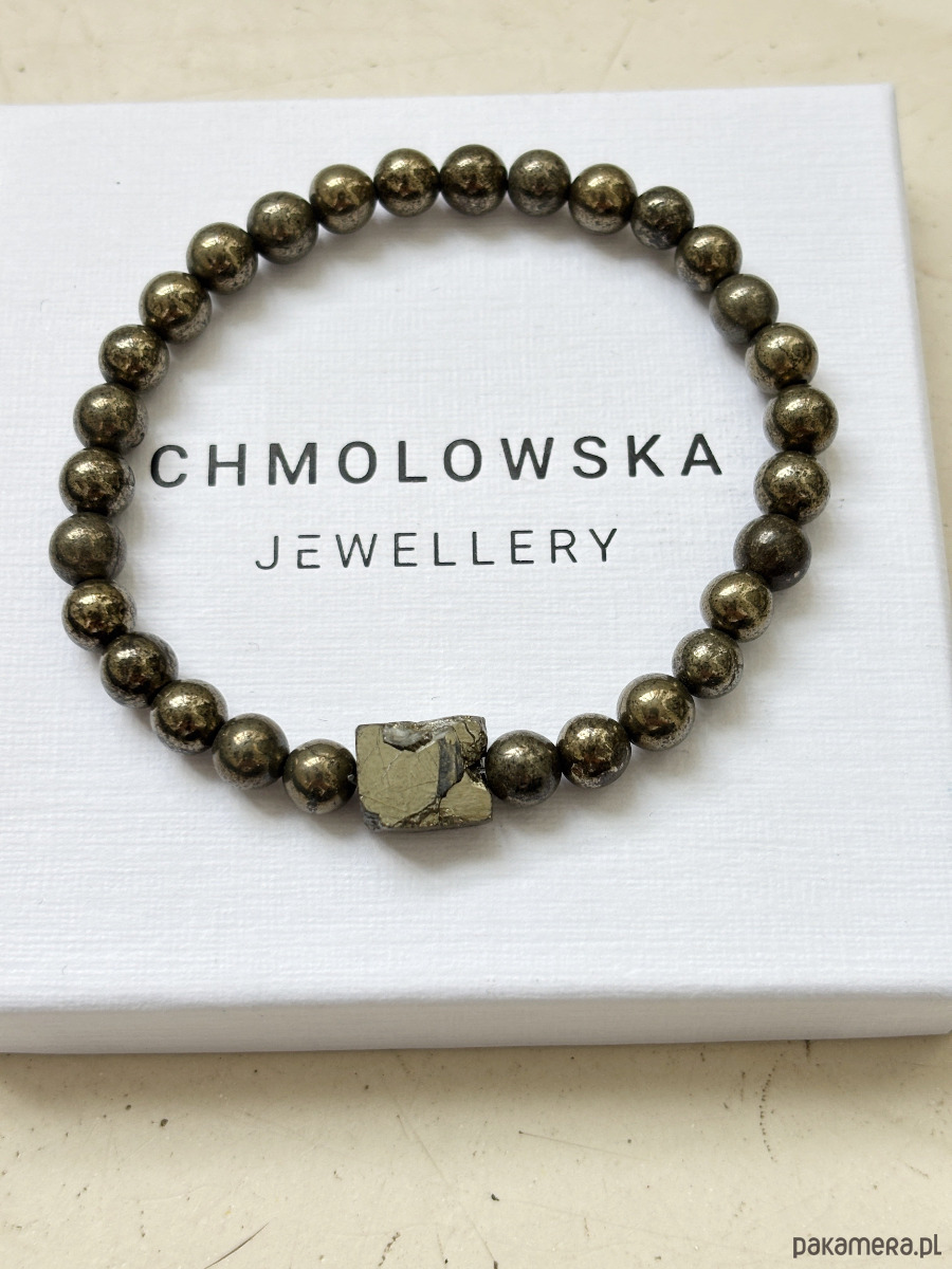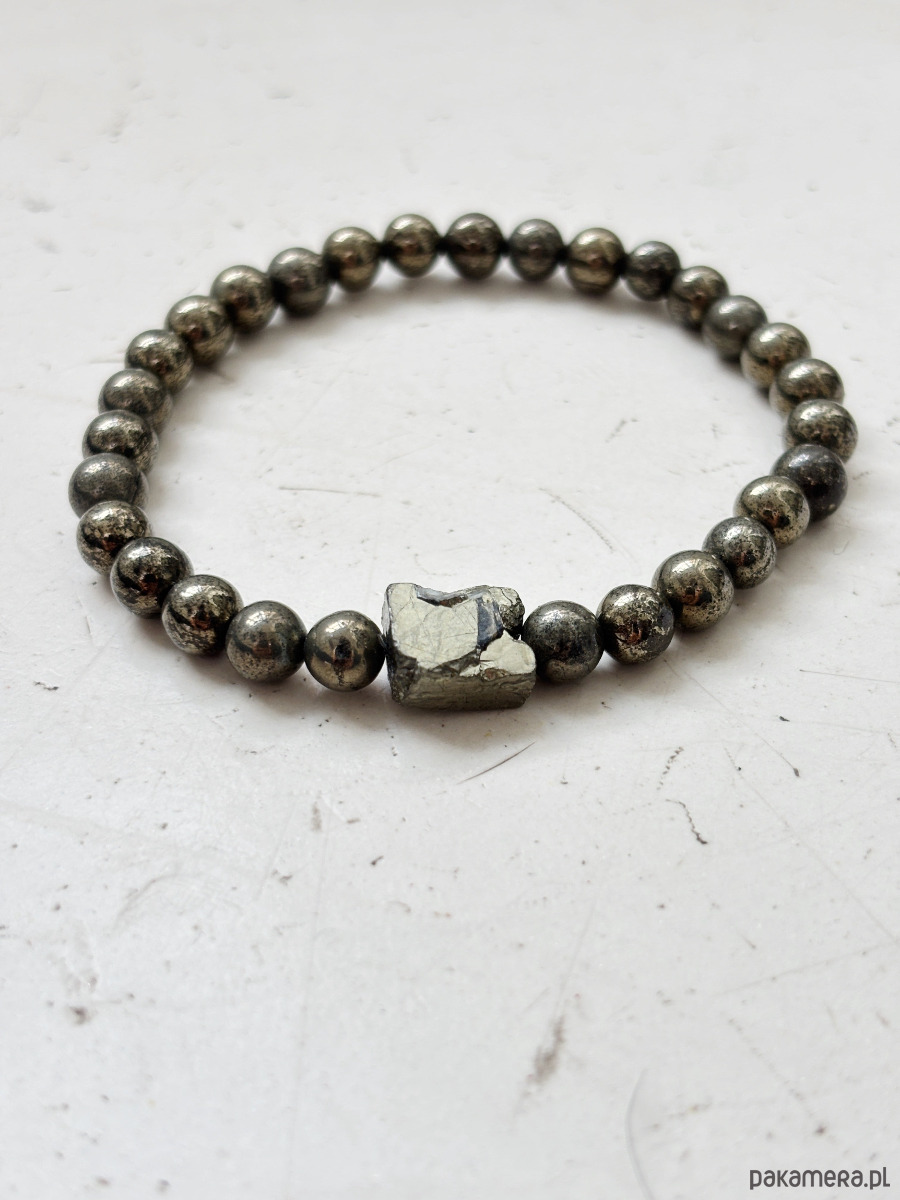 Bransoletka wykonana jest na gumce jubilerskiej z pirytu w postaci kuli i bryły.