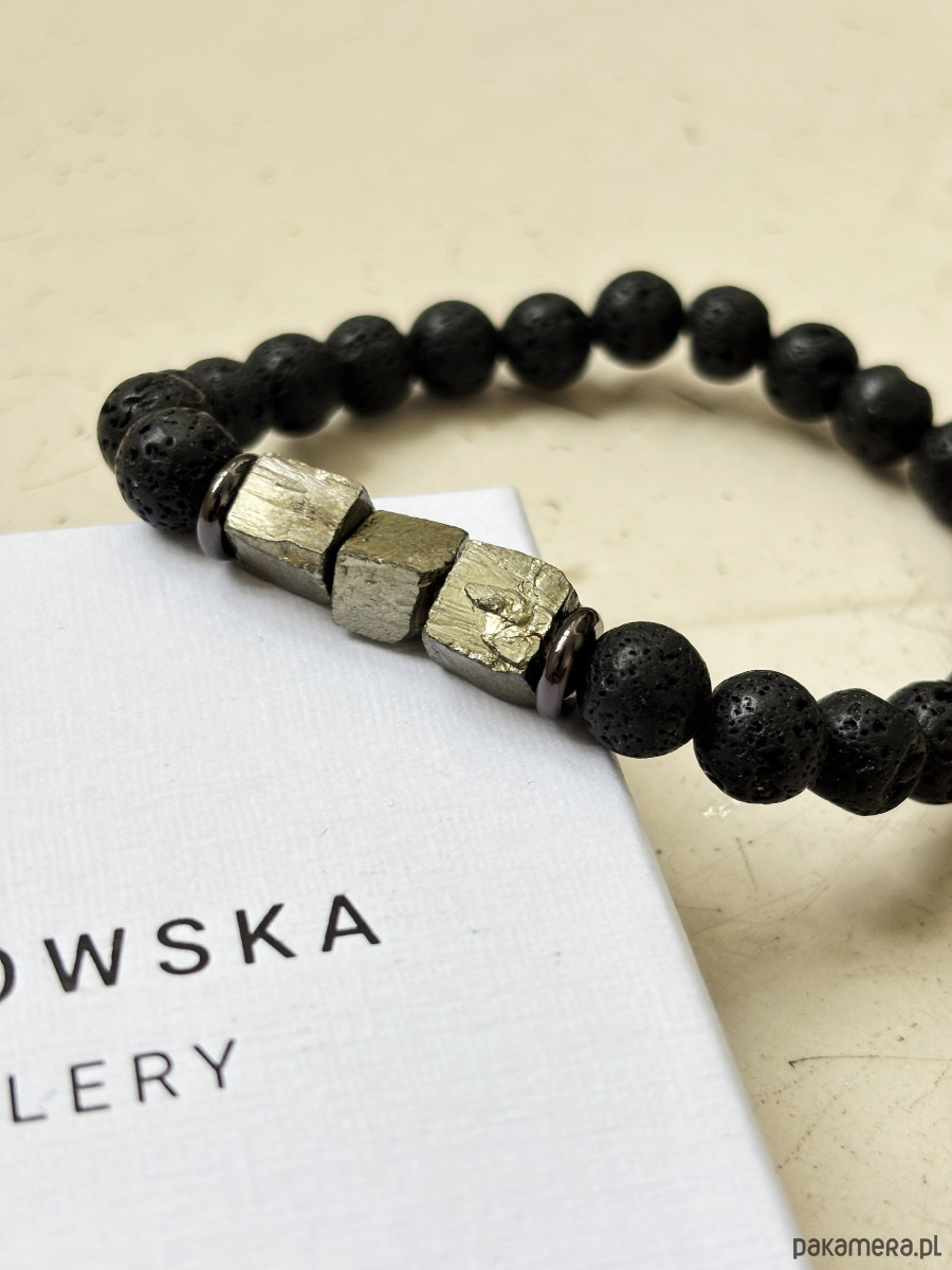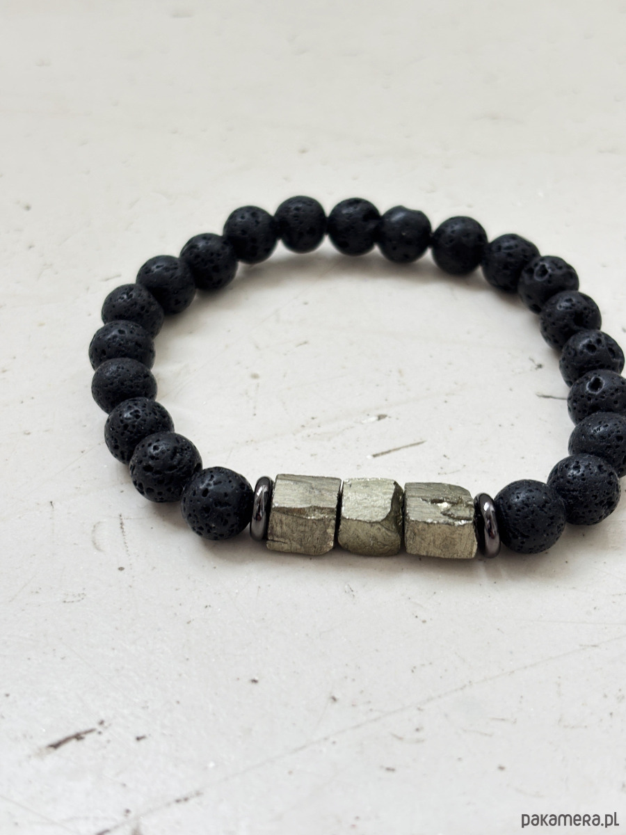 Bransoletka wykonana jest na gumce jubilerskiej z kamieni Lawy Wulkanicznej i surowych brył Pirytu.