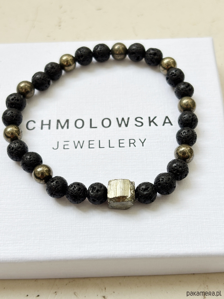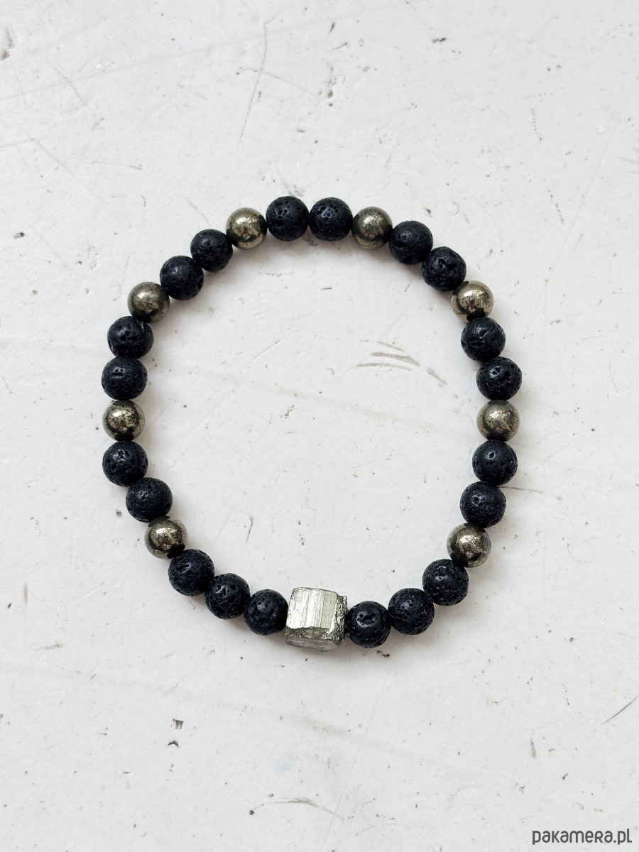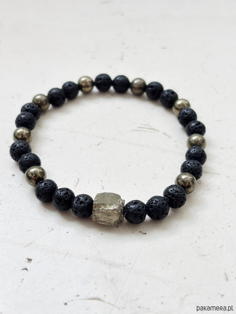Bransoletka wykonana jest na gumce jubilerskiej z kamieni Pirytu i Lawy Wulkanicznej.