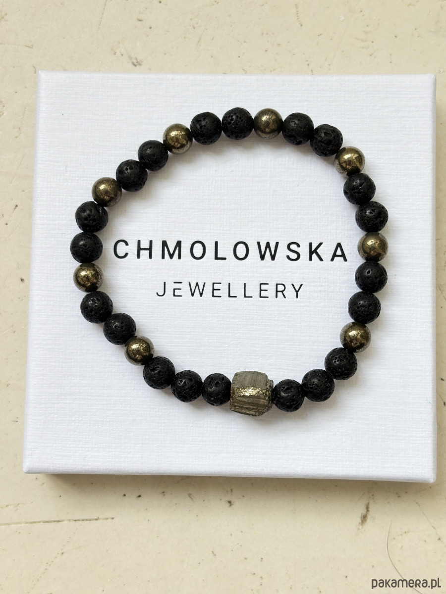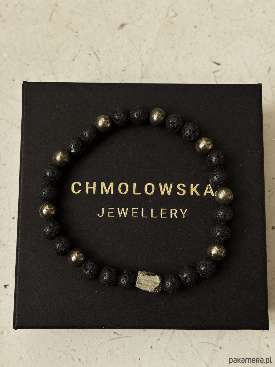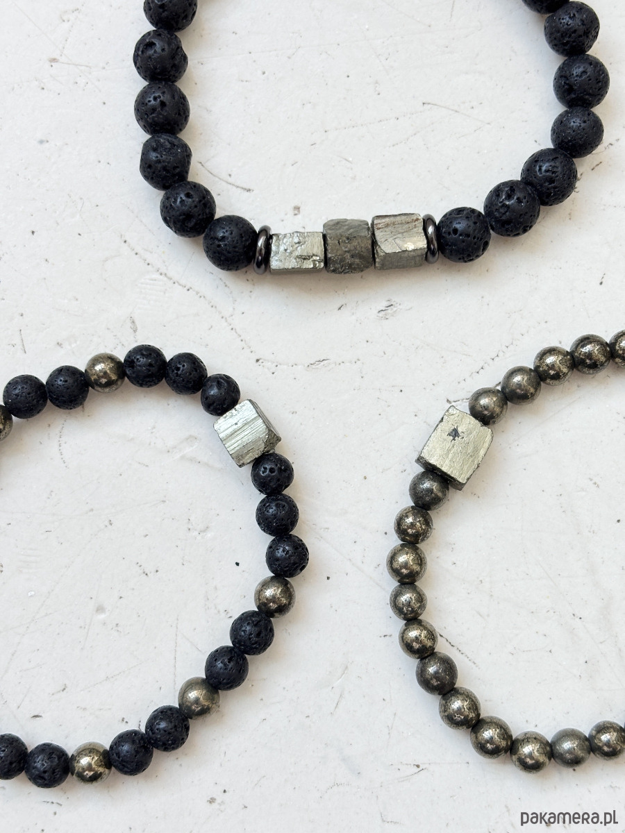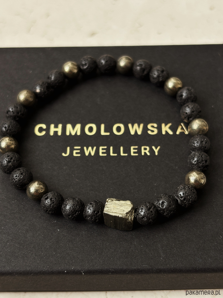 Bransoletka wykonana jest na gumce jubilerskiej z kamieni Pirytu i Lawy Wulkanicznej.