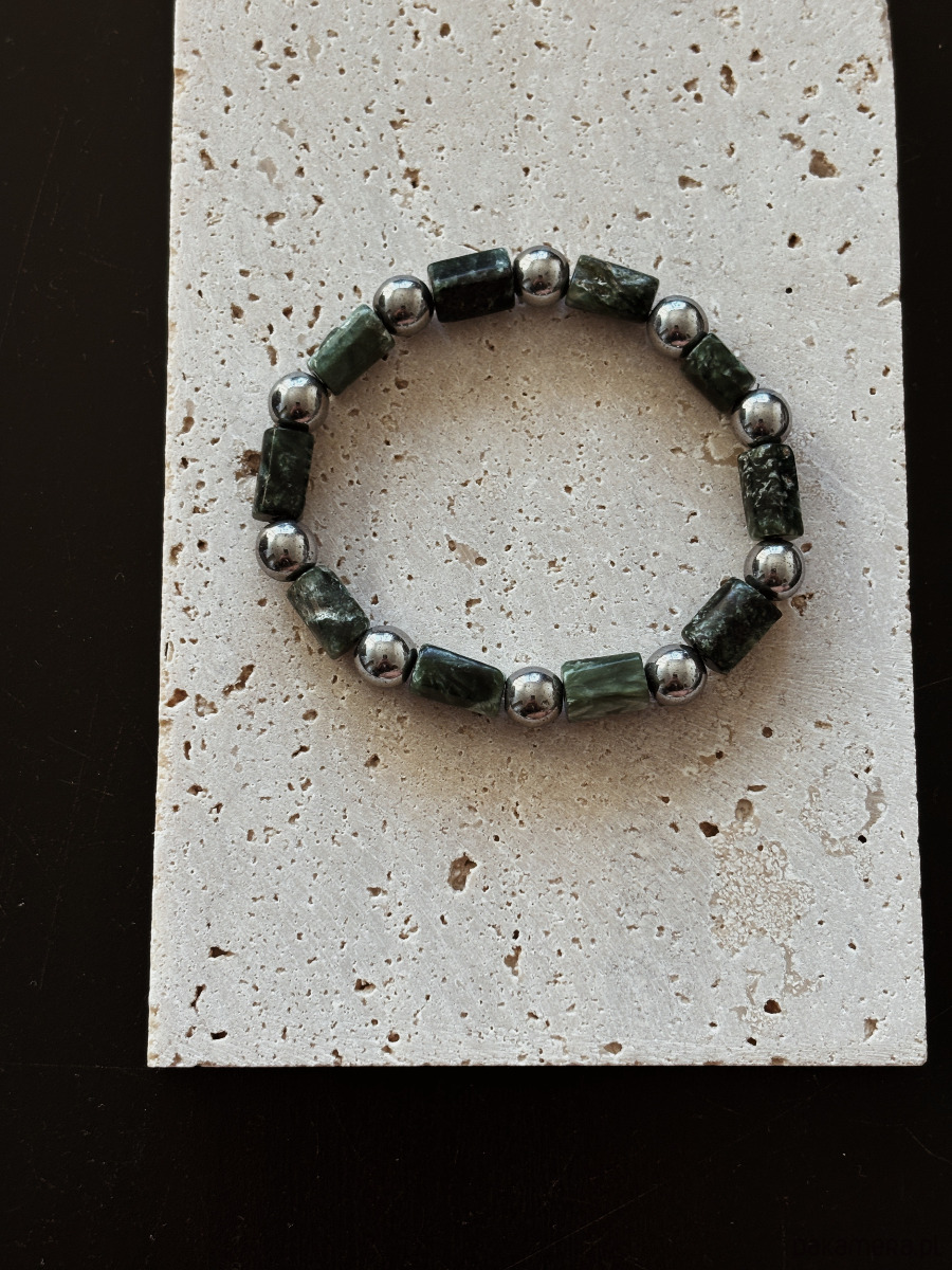 Bransoletka wykonana jest na gumce jubilerskiej z kamieni Serafinitu i Hematytu.