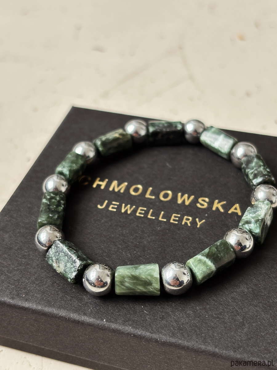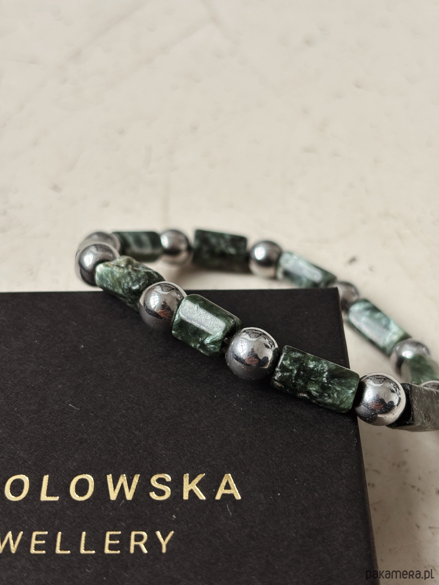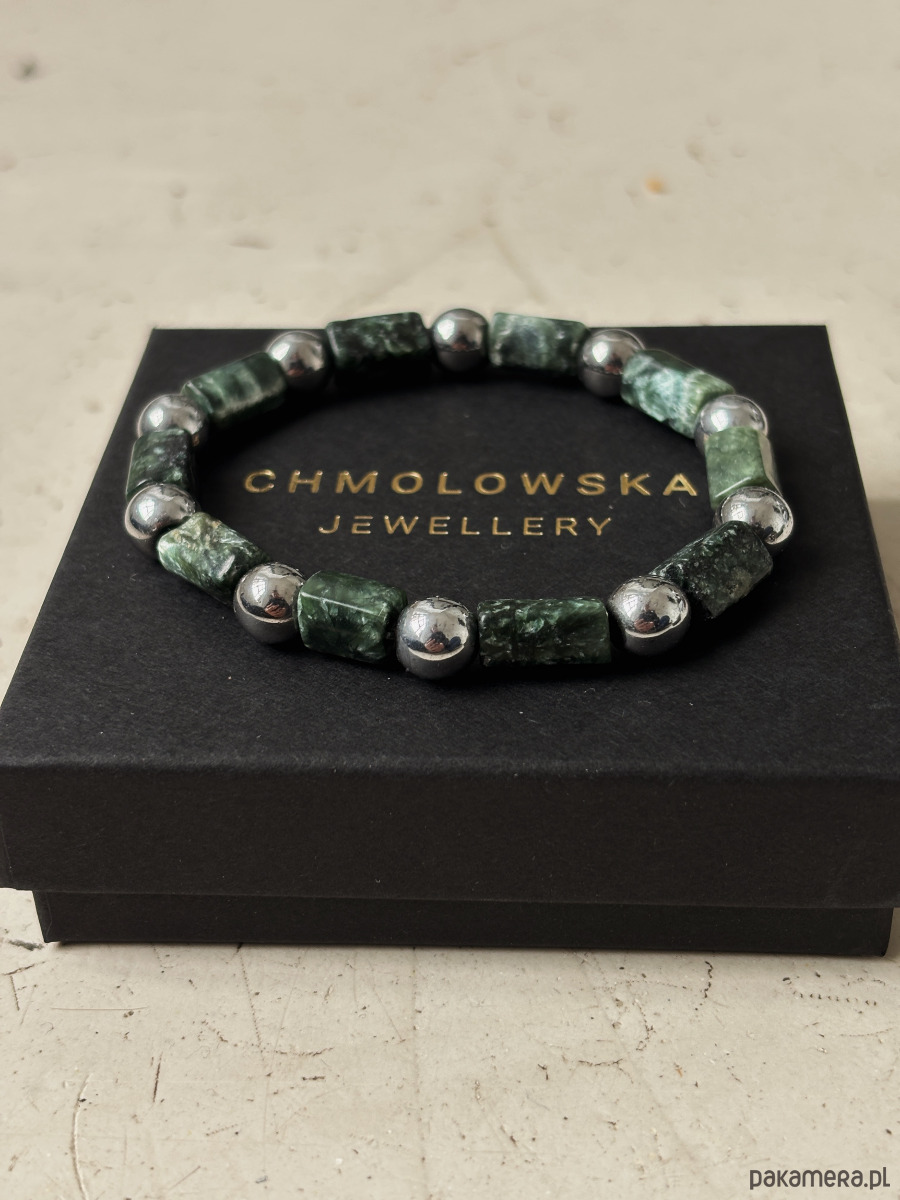 Bransoletka wykonana jest na gumce jubilerskiej z kamieni Serafinitu i Hematytu.