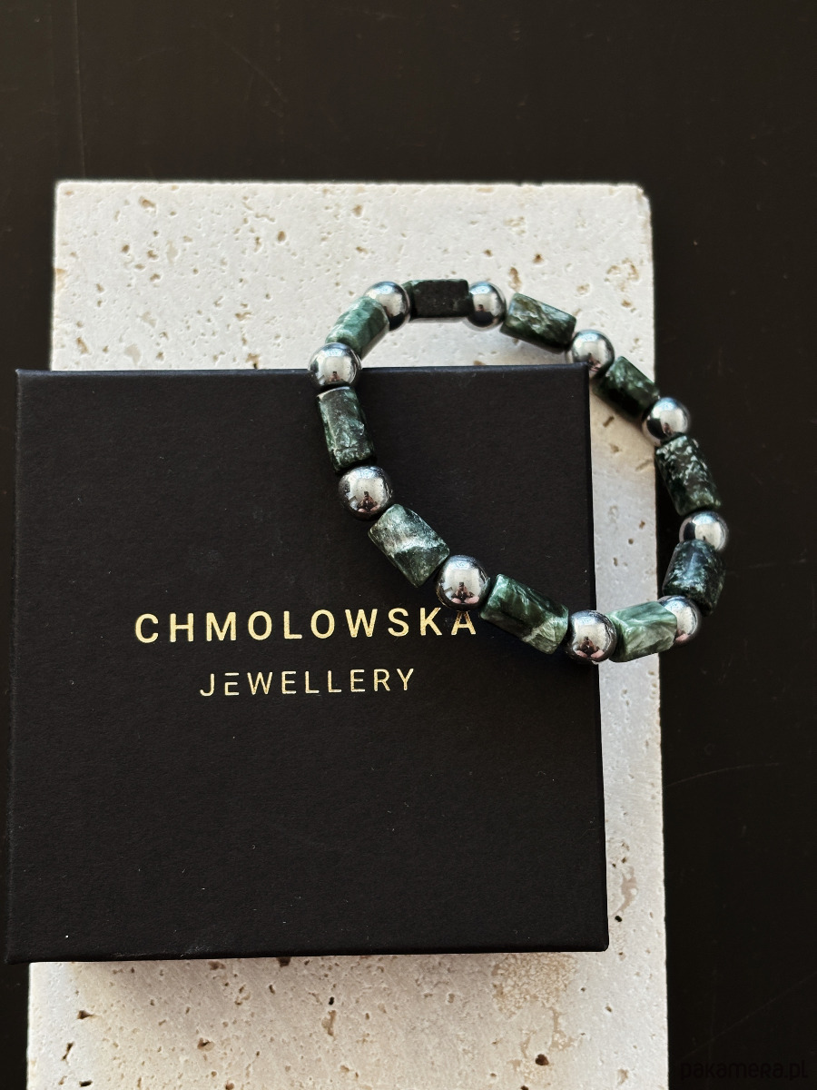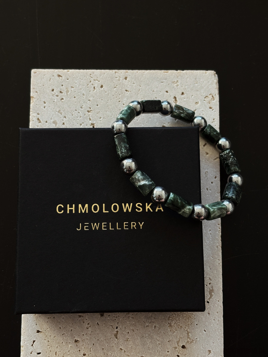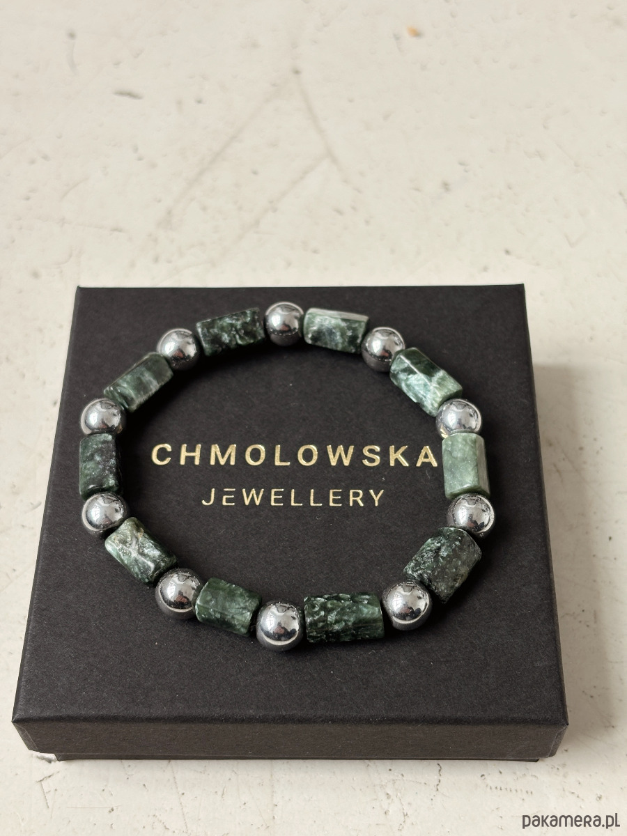 Bransoletka wykonana jest na gumce jubilerskiej z kamieni Serafinitu i Hematytu.