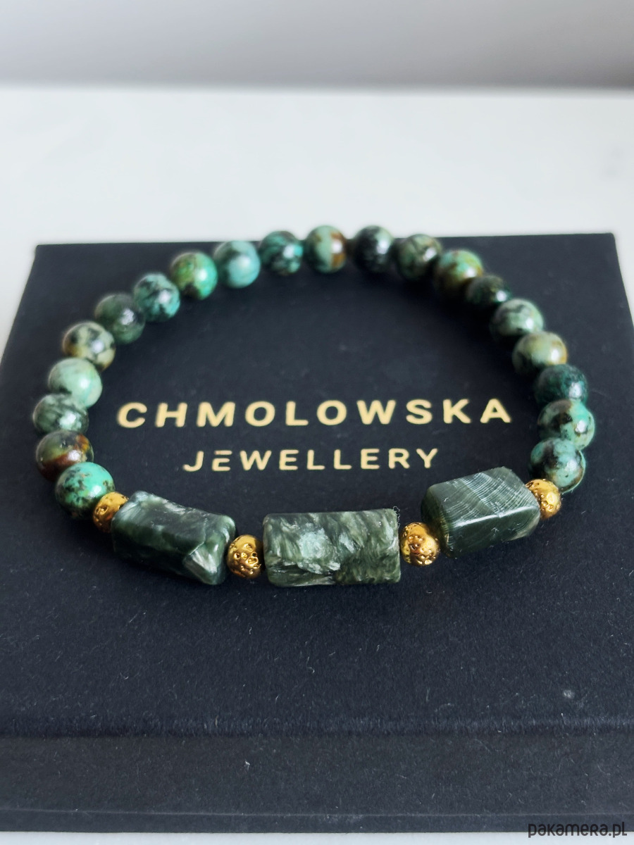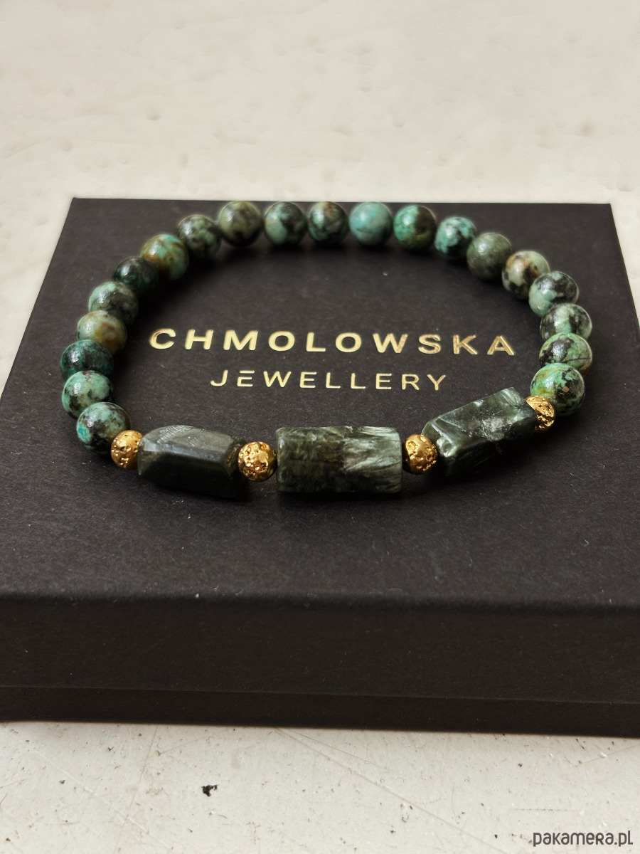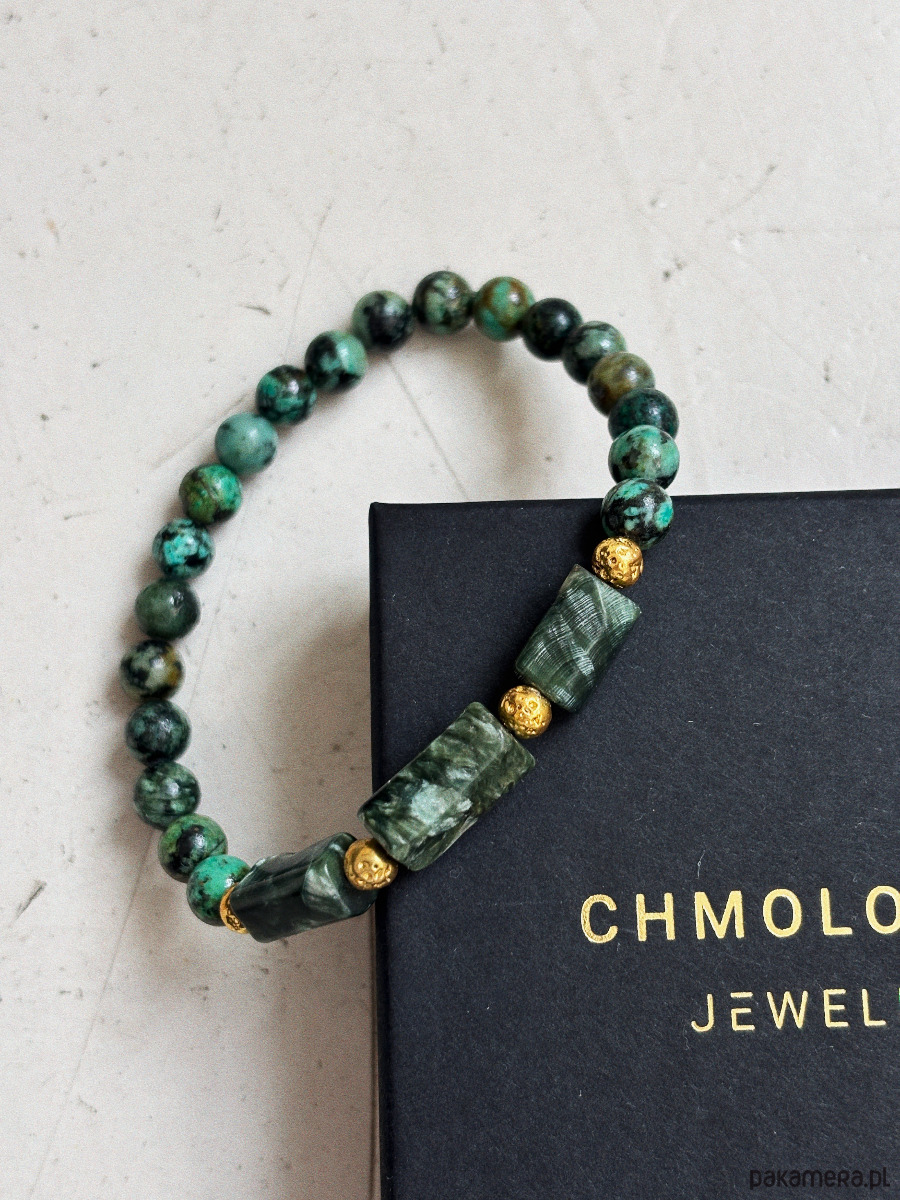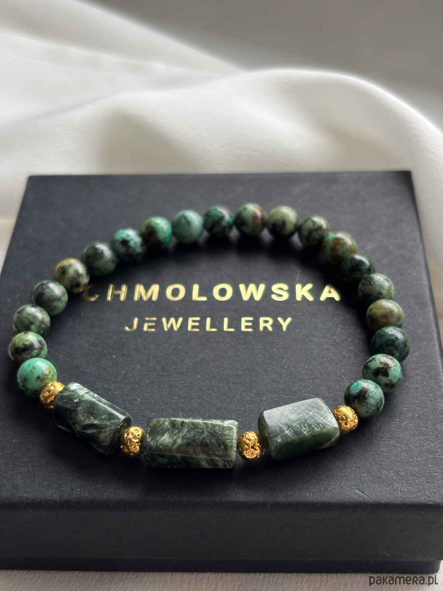 Bransoletka wykonana jest na gumce jubilerskiej, z kamieni Turkusu Afrykańskiego, Serafinitu oraz pozłacanych przekładek.