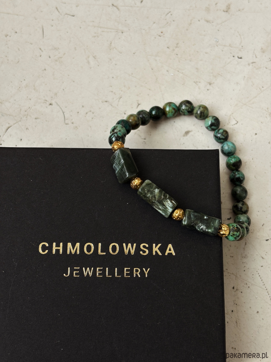 Bransoletka wykonana jest na gumce jubilerskiej, z kamieni Turkusu Afrykańskiego, Serafinitu oraz pozłacanych przekładek.