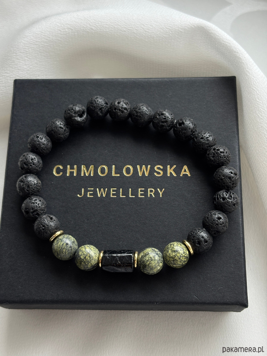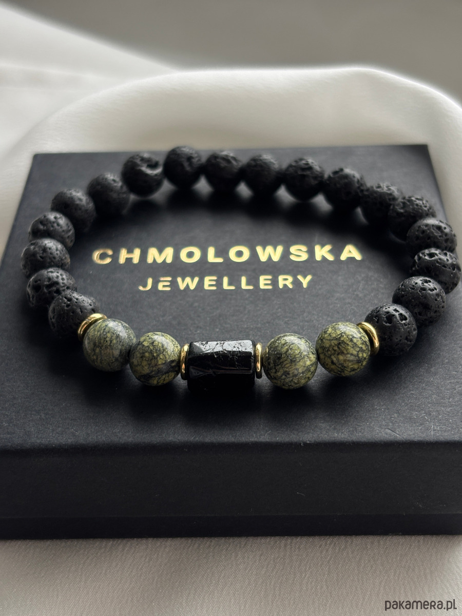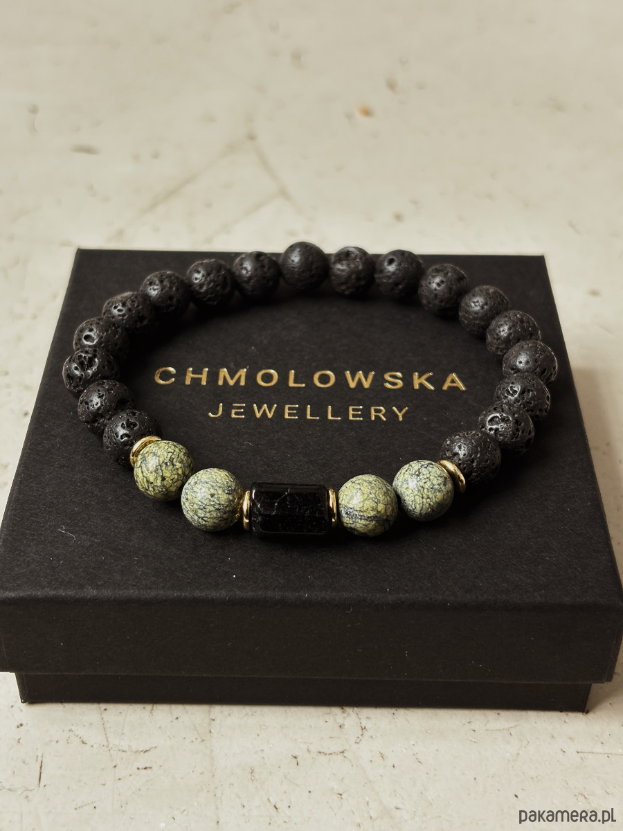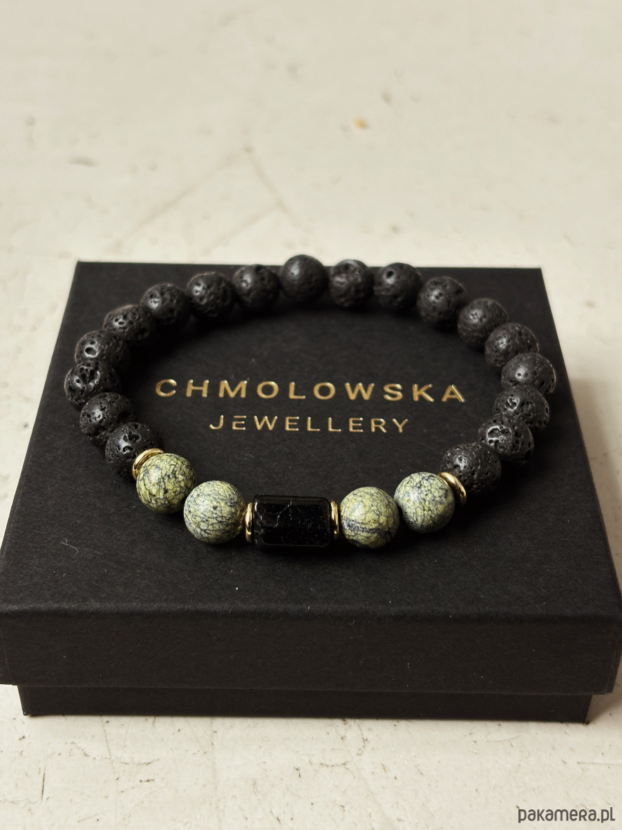 Bransoletka wykonana jest na gumce jubilerskiej z użyciem kamieni serpentynitu, bryły turmalinu, lawy wulkanicznej i pozłacanych przekładek.