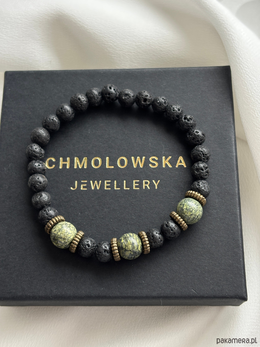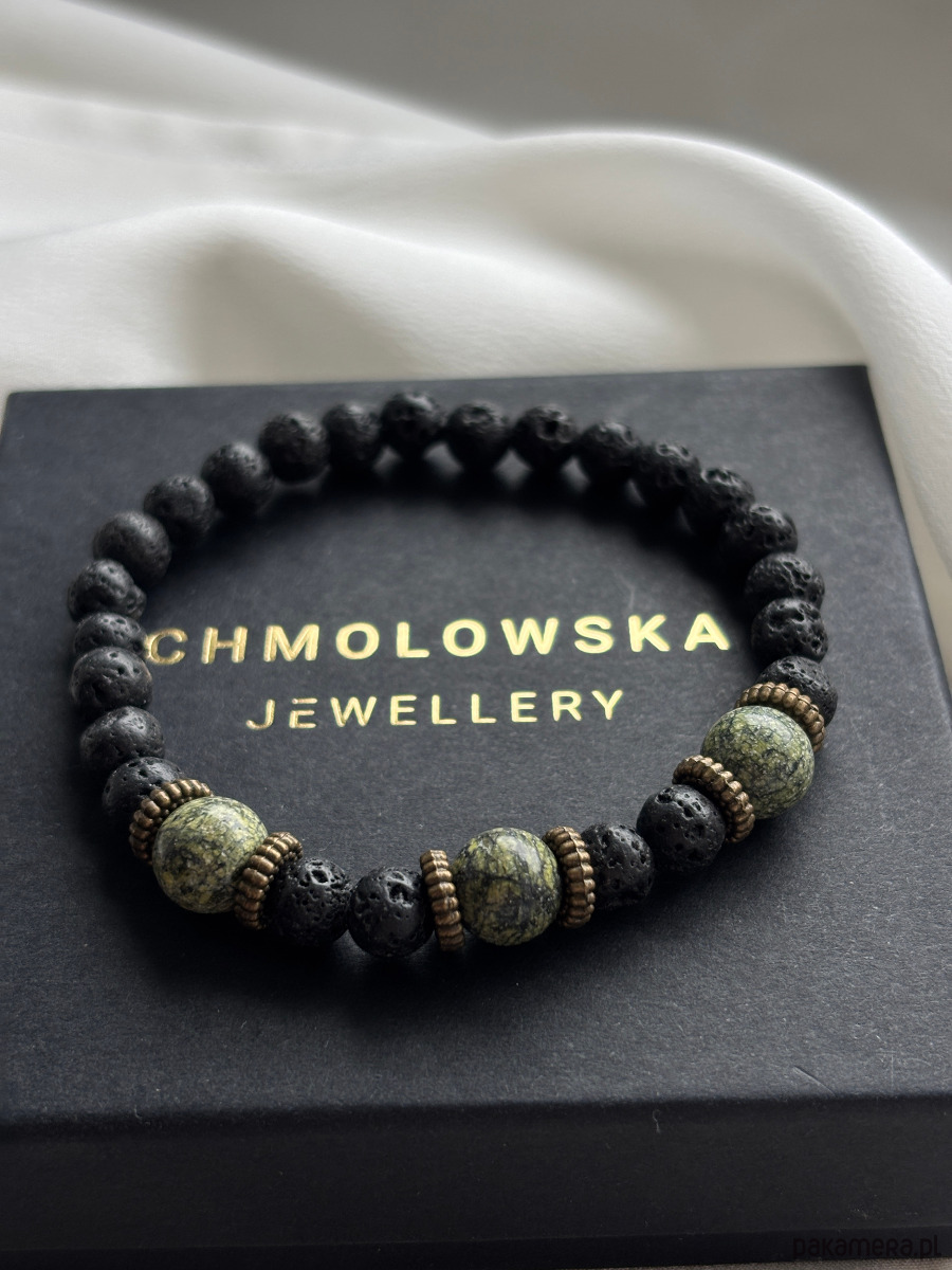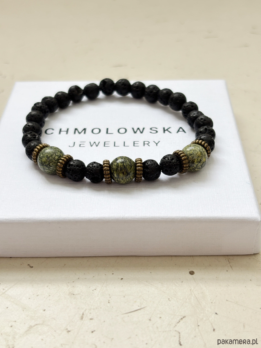 Bransoletka wykonana została na gumce jubilerskiej z kamieni lawy i serpentynitu i pozłacanych przekładek.