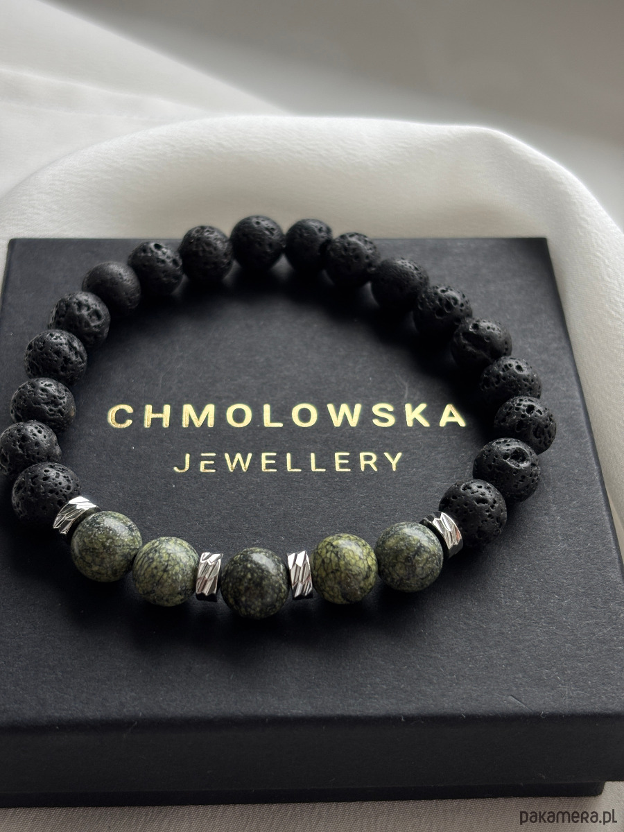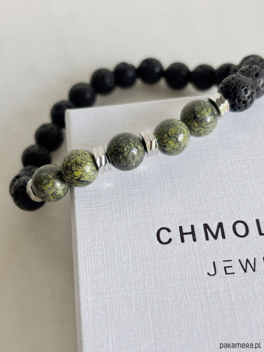 Bransoletka wykonana jest na gumce jubilerskiej z kamieni Serpentynitu, Lawy Wulkanicznej i srebrnych przekładek.