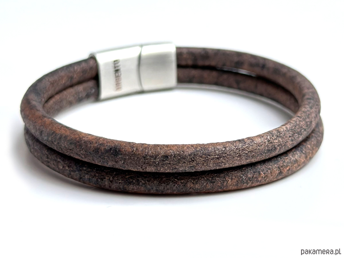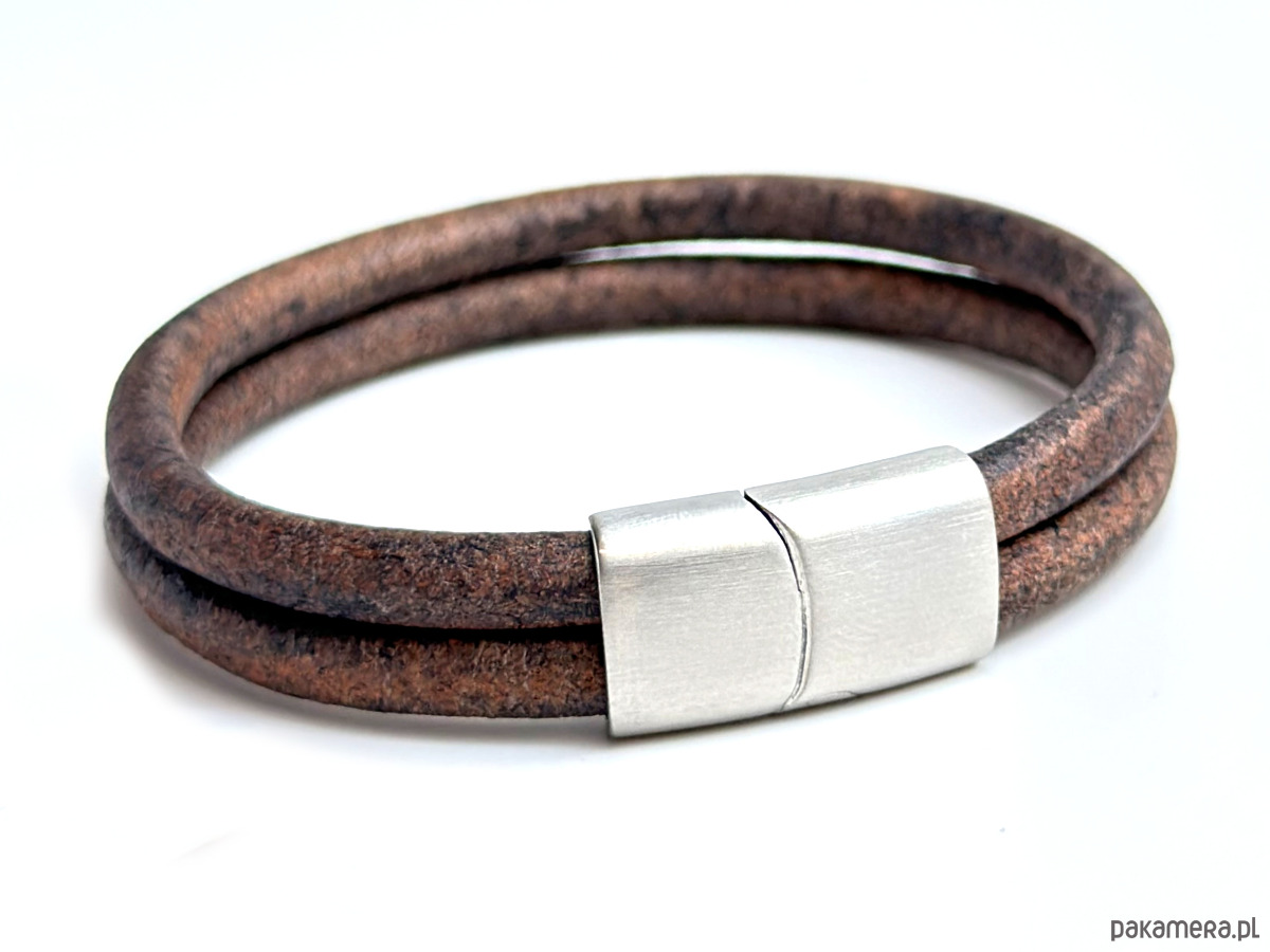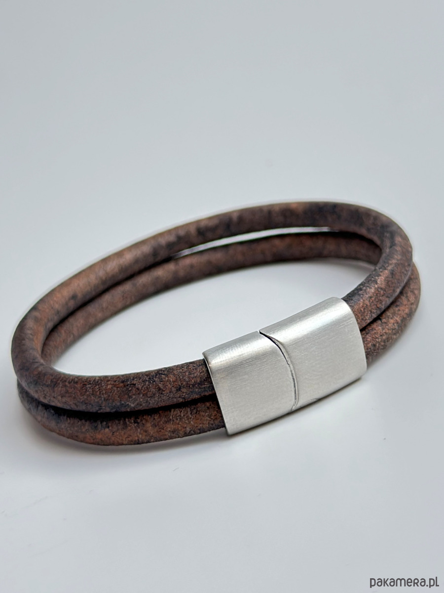 Modna bransoleta męska zrobiona z rzemienia gładkiego w kolorze szaro-brązowym. Rzemień ze skóry naturalnej garbowany roślinne.