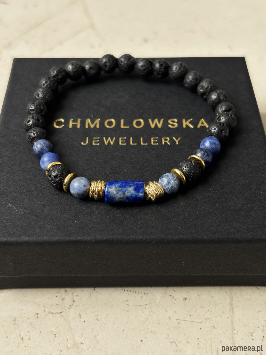 Bransoletka wykonana jest na gumce jubilerskiej z kamieni Lawy Wulkanicznej, Sodalitu i Lapisu Lazuli oraz pozłacanych przekładek.