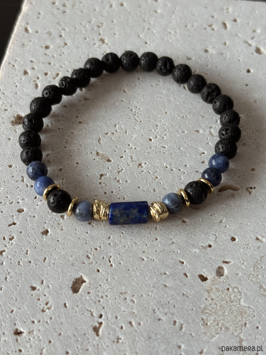 Bransoletka wykonana jest z kamieni: lawa, sodalit i lapis lazuli oraz pozałacanych przekładek.