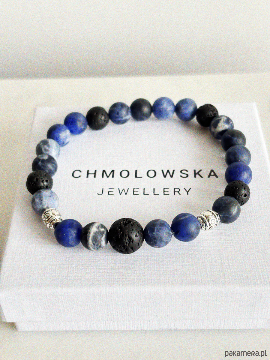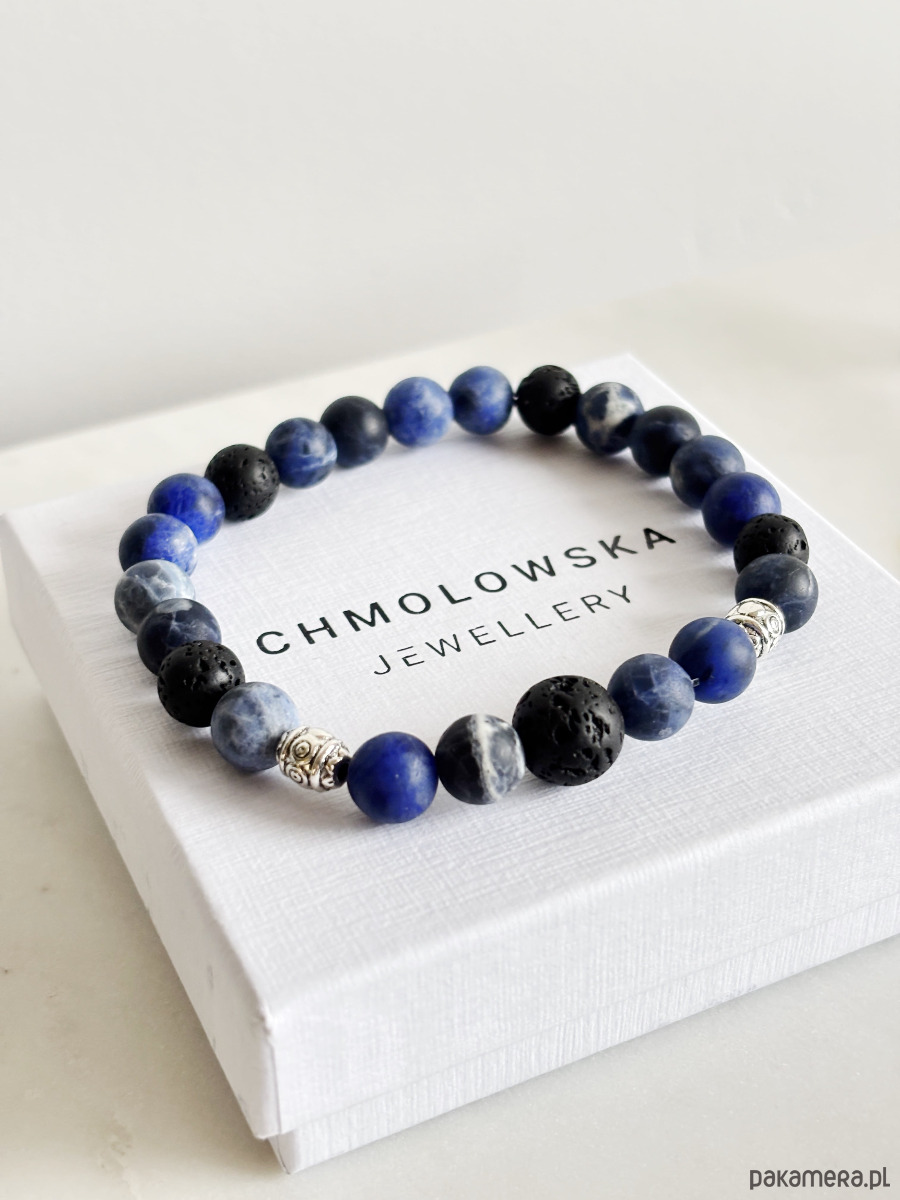 Bransoletka wykonana jest na gumce jubilerskiej z użyciem kamieni lawa, sodalit i srebrnych przekładek.