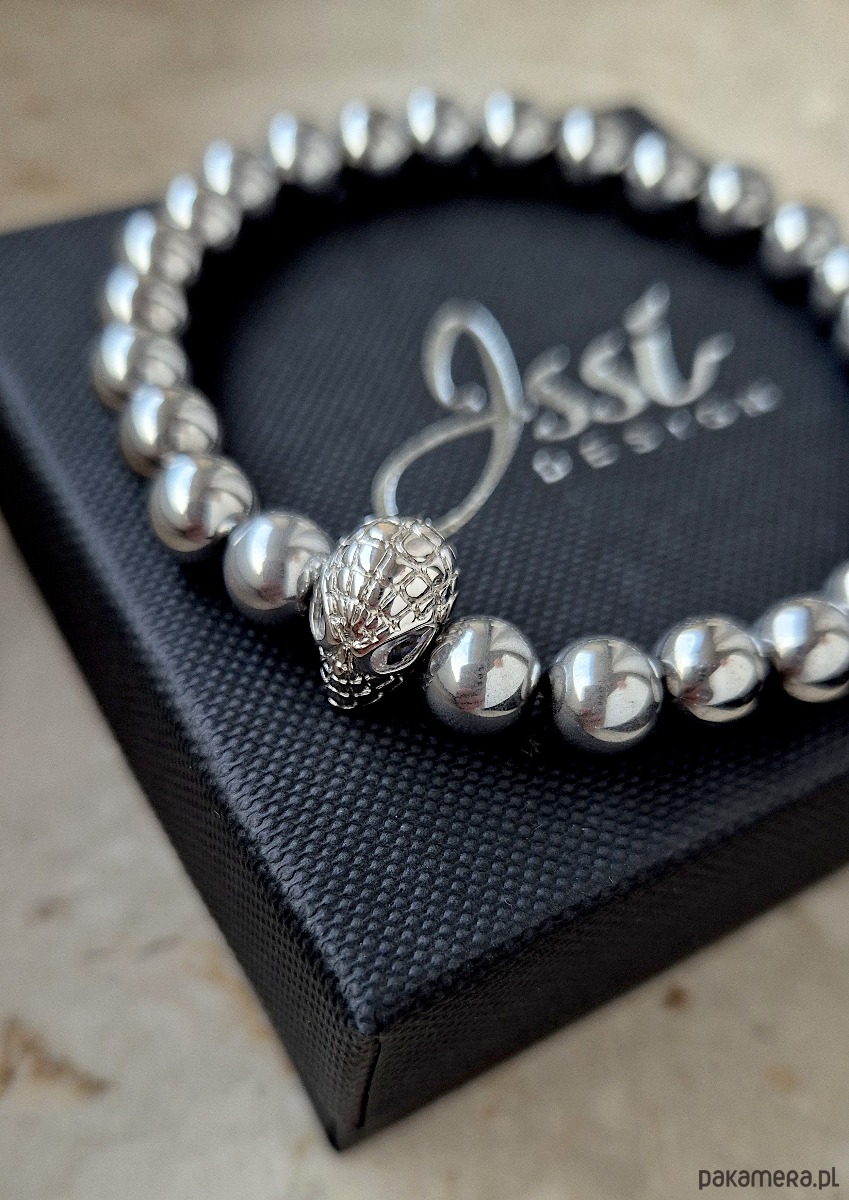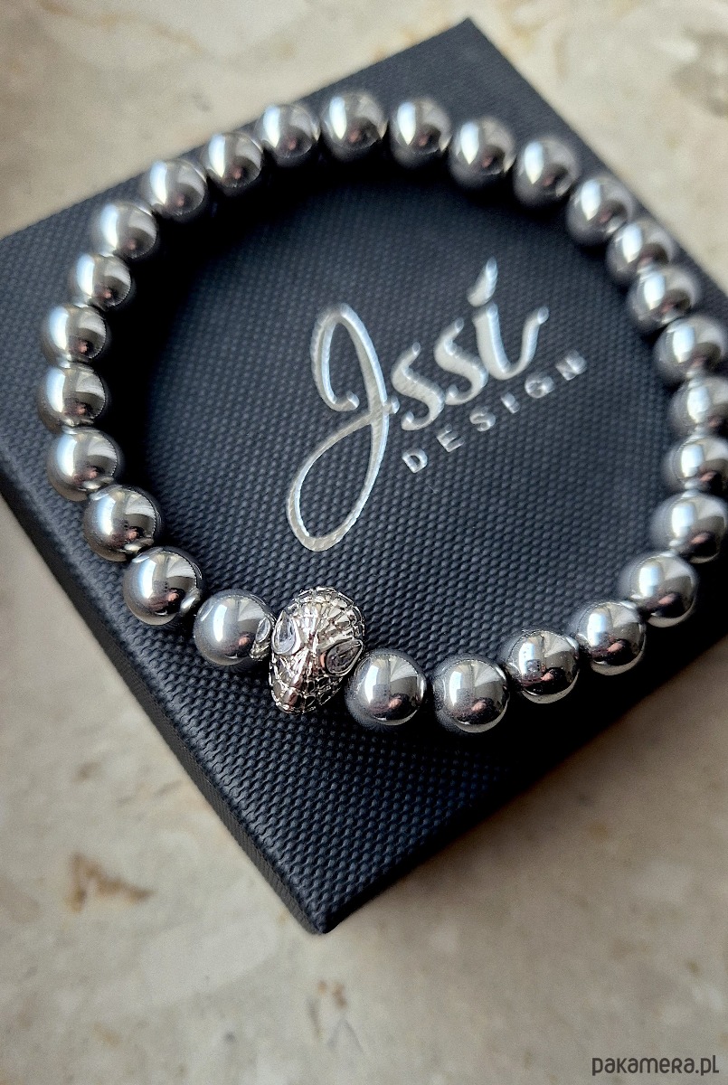 Bransoletka męska wykonana z naturalnych hematytów srebrnych 8mm i kryształków Swarovskiego. Na wzmacnianej silikonowej gumce.