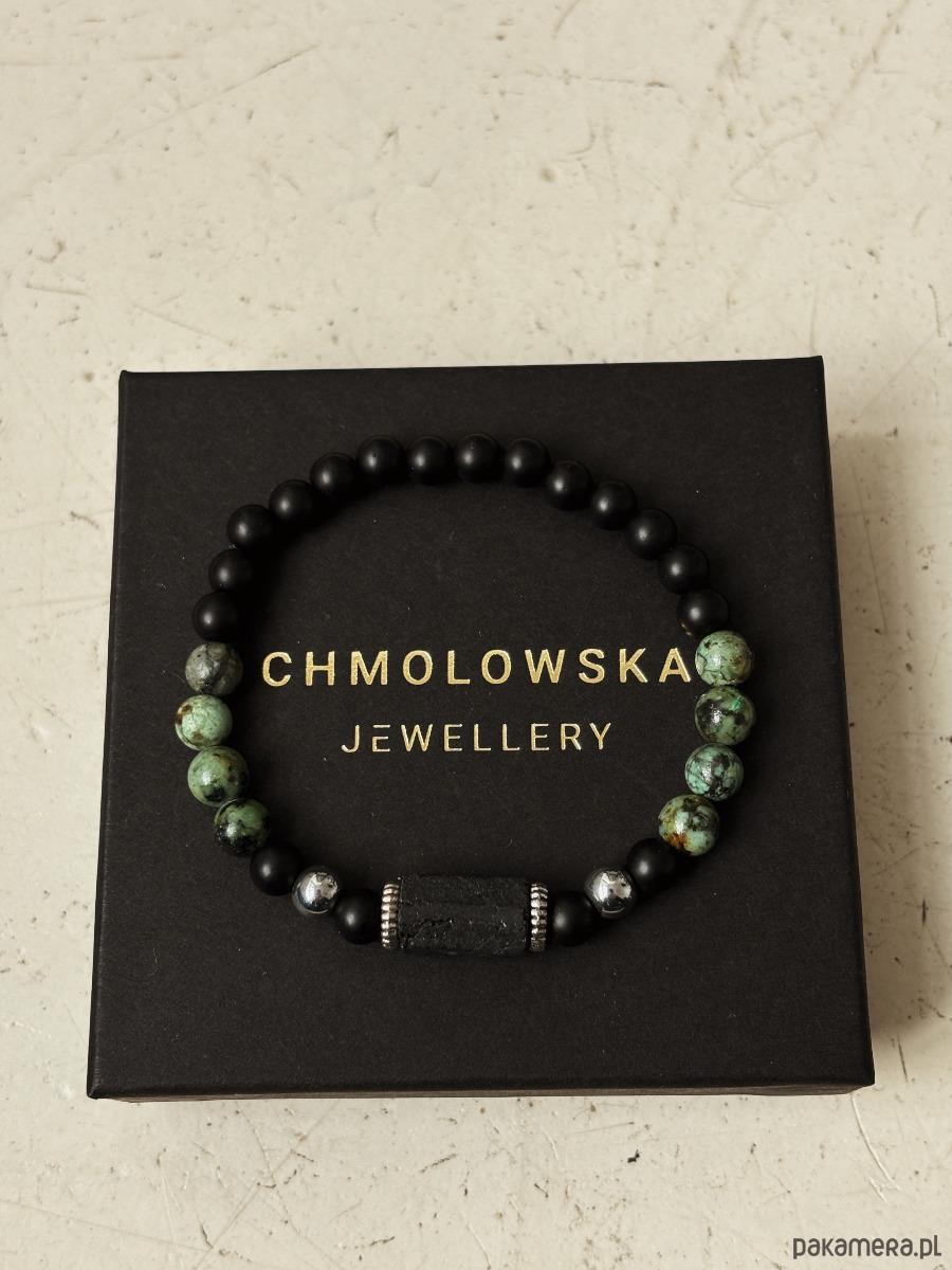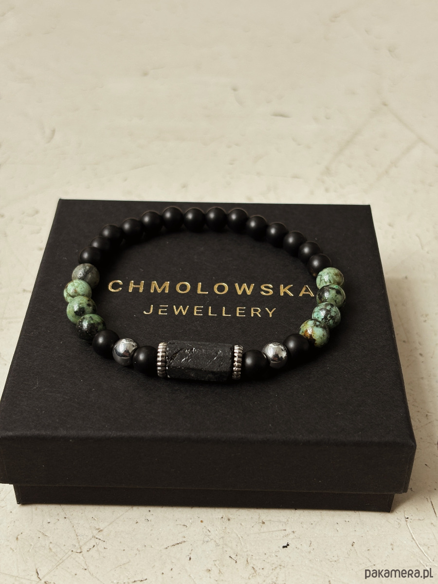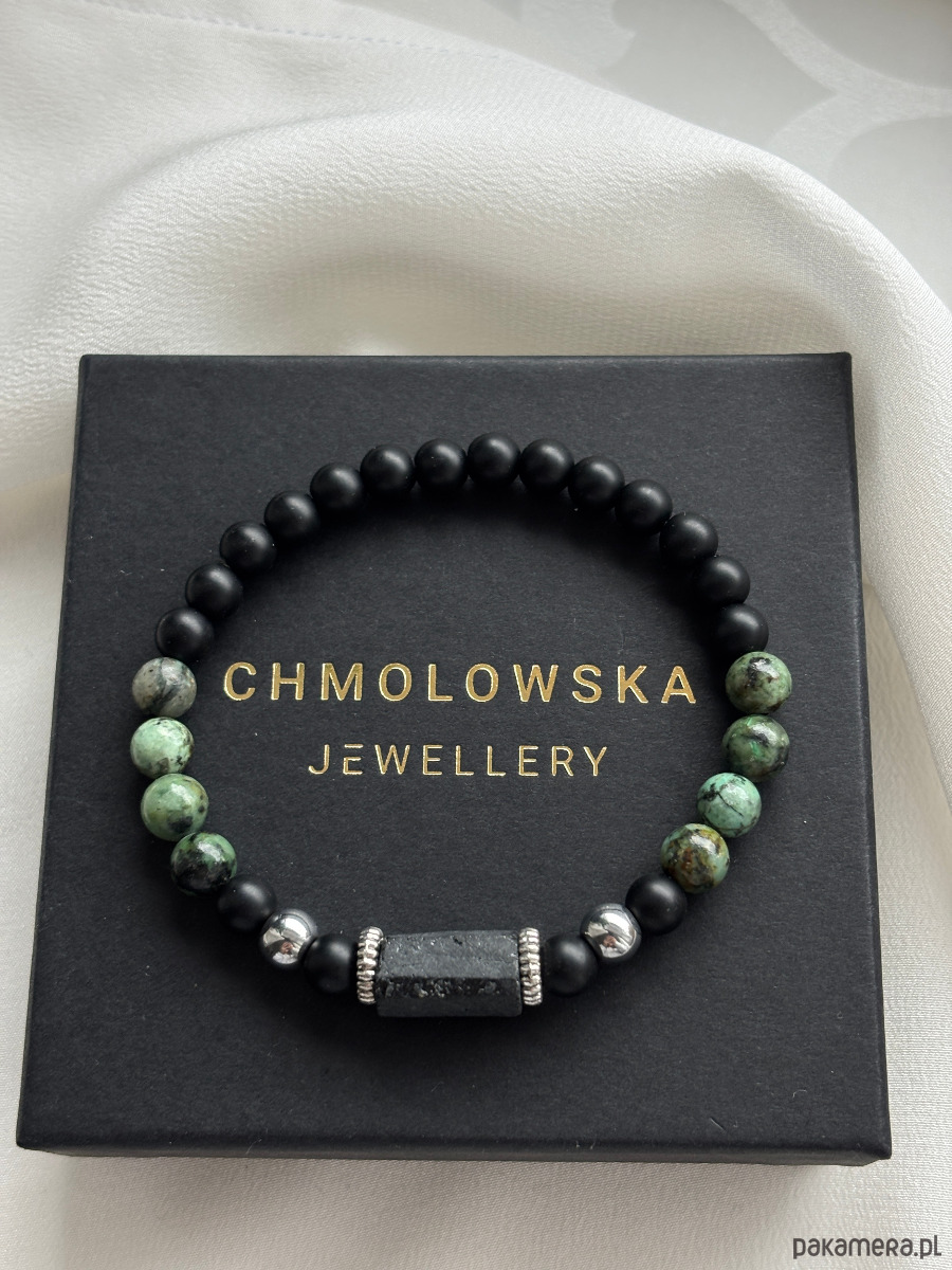 Bransoletka wykonana jest na gumce jubilerskiej z Turkusu Afrykańskiego, Lawy i Turmalinu, a także przekładek.