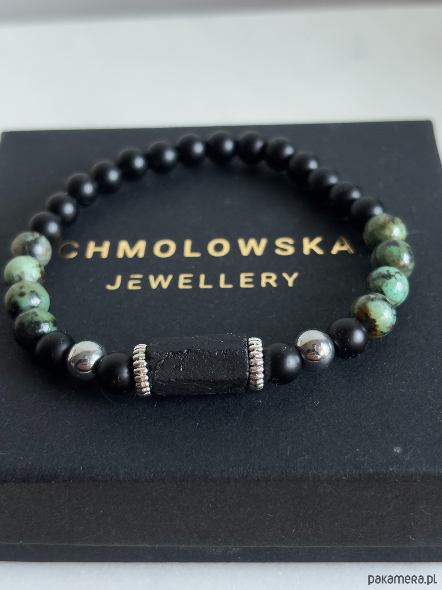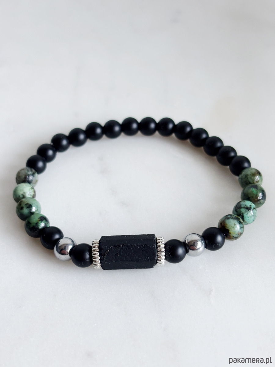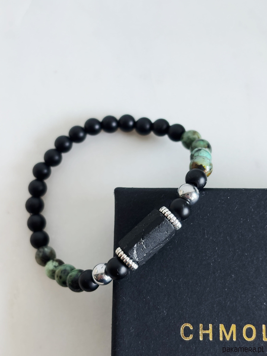 Bransoletka wykonana jest na gumce jubilerskiej z użyciem kamieni turkus afrykański, Turmalinu i onyksu.