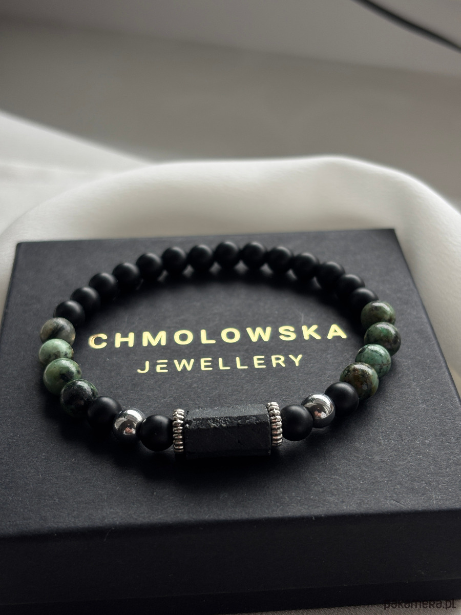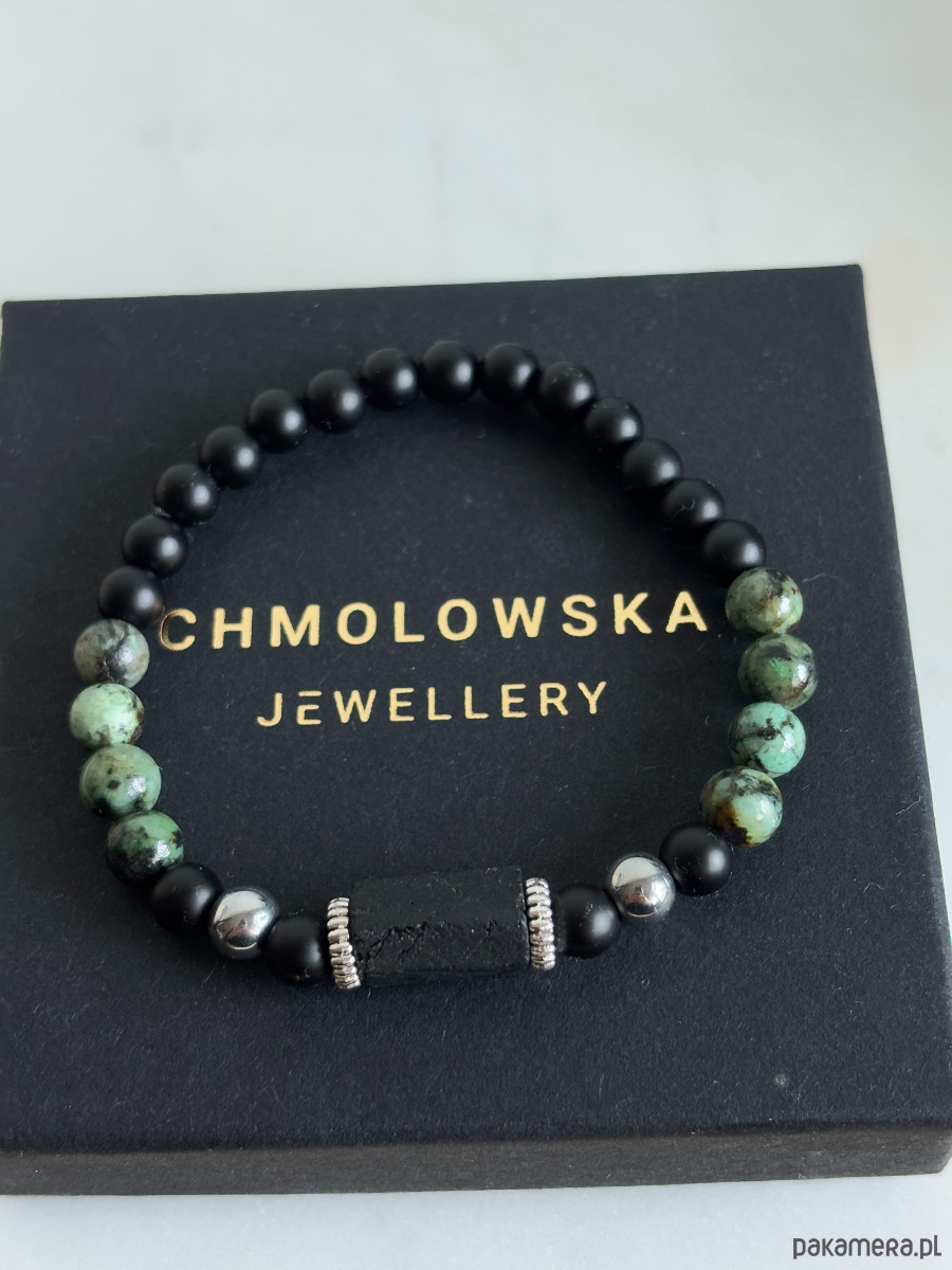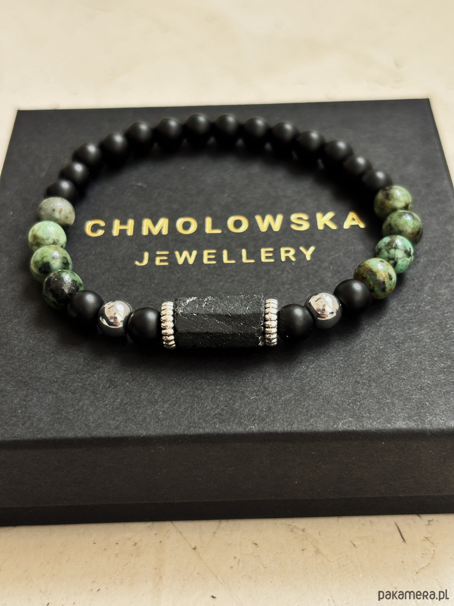 Bransoletka wykonana jest na gumce jubilerskiej z użyciem kamieni turkus afrykański, Turmalinu i onyksu.