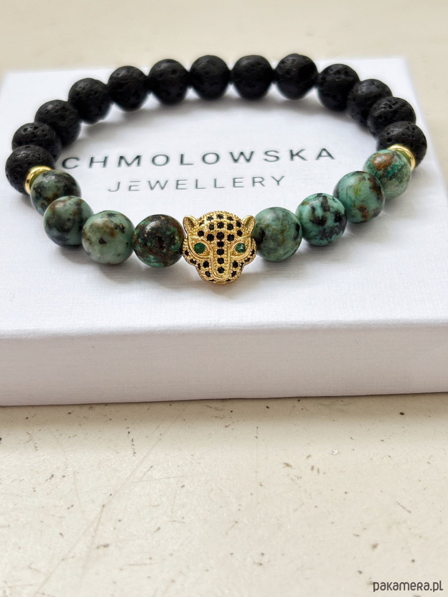 Bransoletka wykonana została z kamieni lawy i turkusu afrykańskiego oraz pozłacanej przekładki.