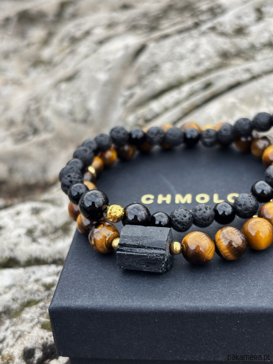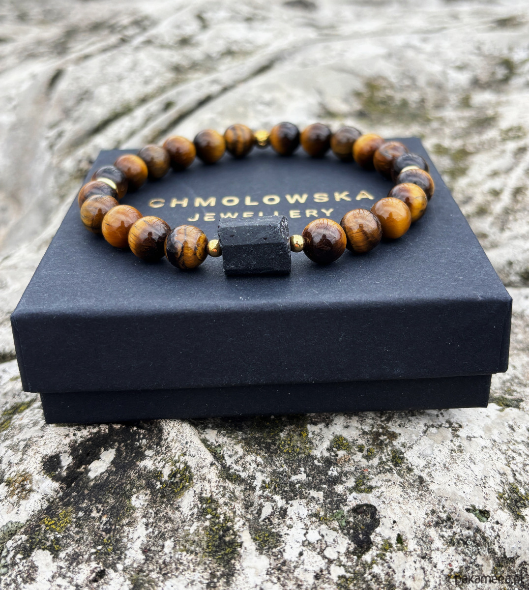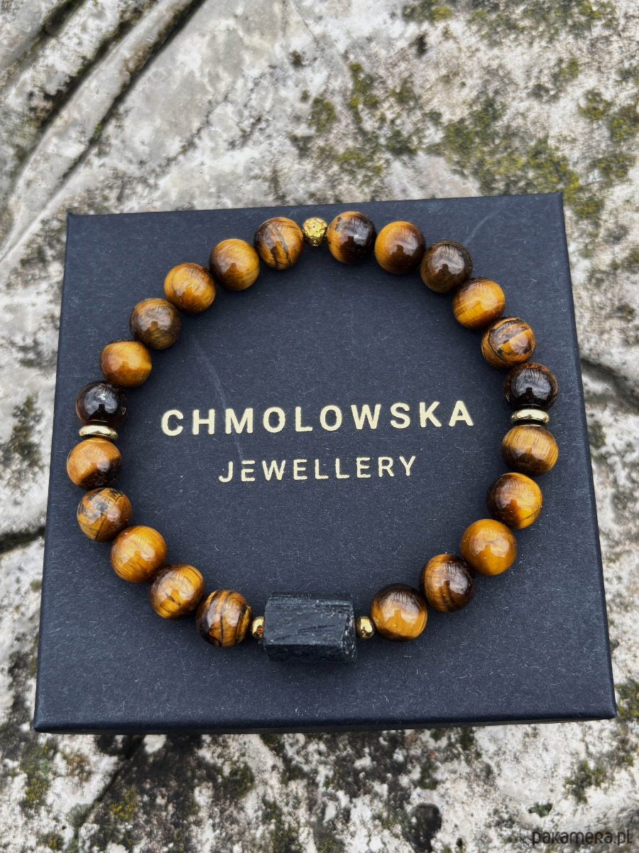 Bransoletka wykonana jest na gumce jubilerskiej z użyciem kamieni tygrysie oko,turmalin oraz pozłacanych przekładek.