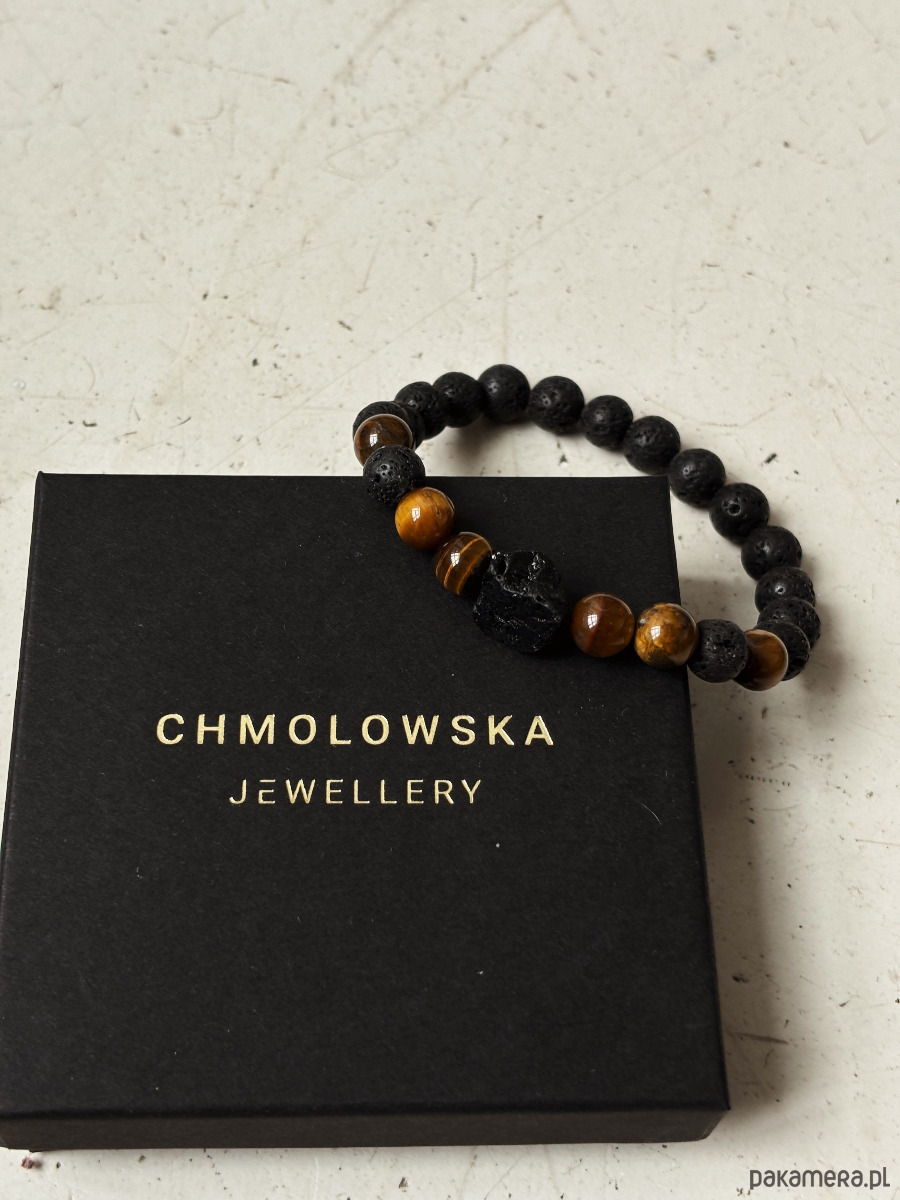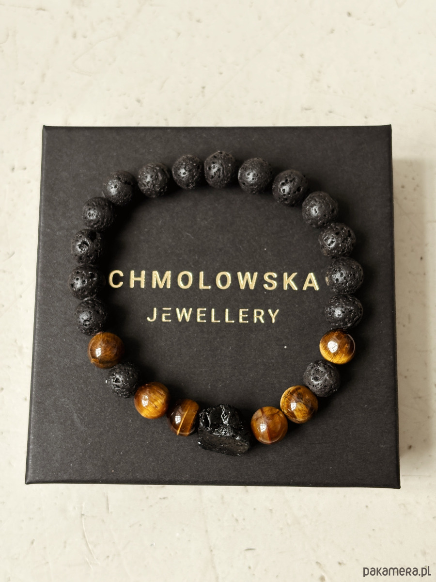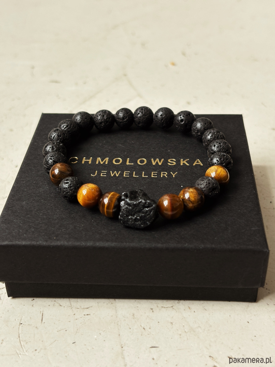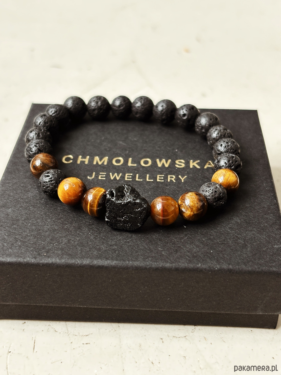Bransoletka wykonana jest na gumce elastycznej z kamieni Lawy Wulkanicznej, Tygrysiego Oka i Turmalinu czarnego.