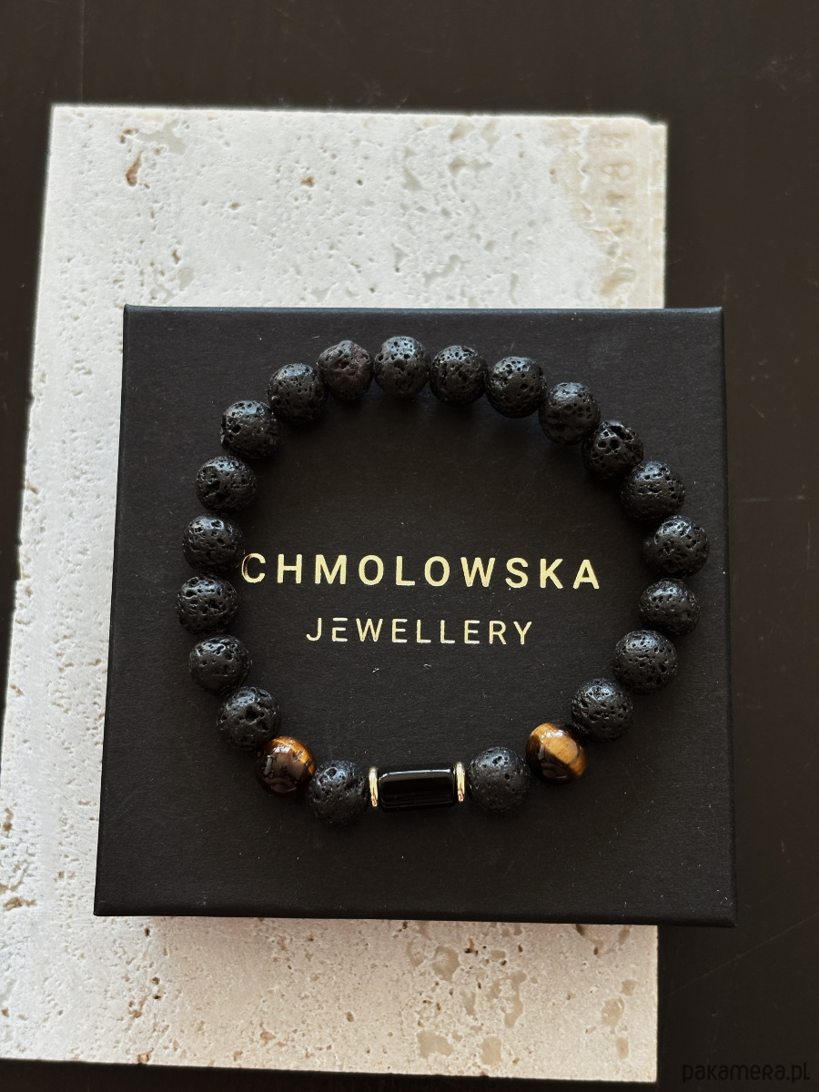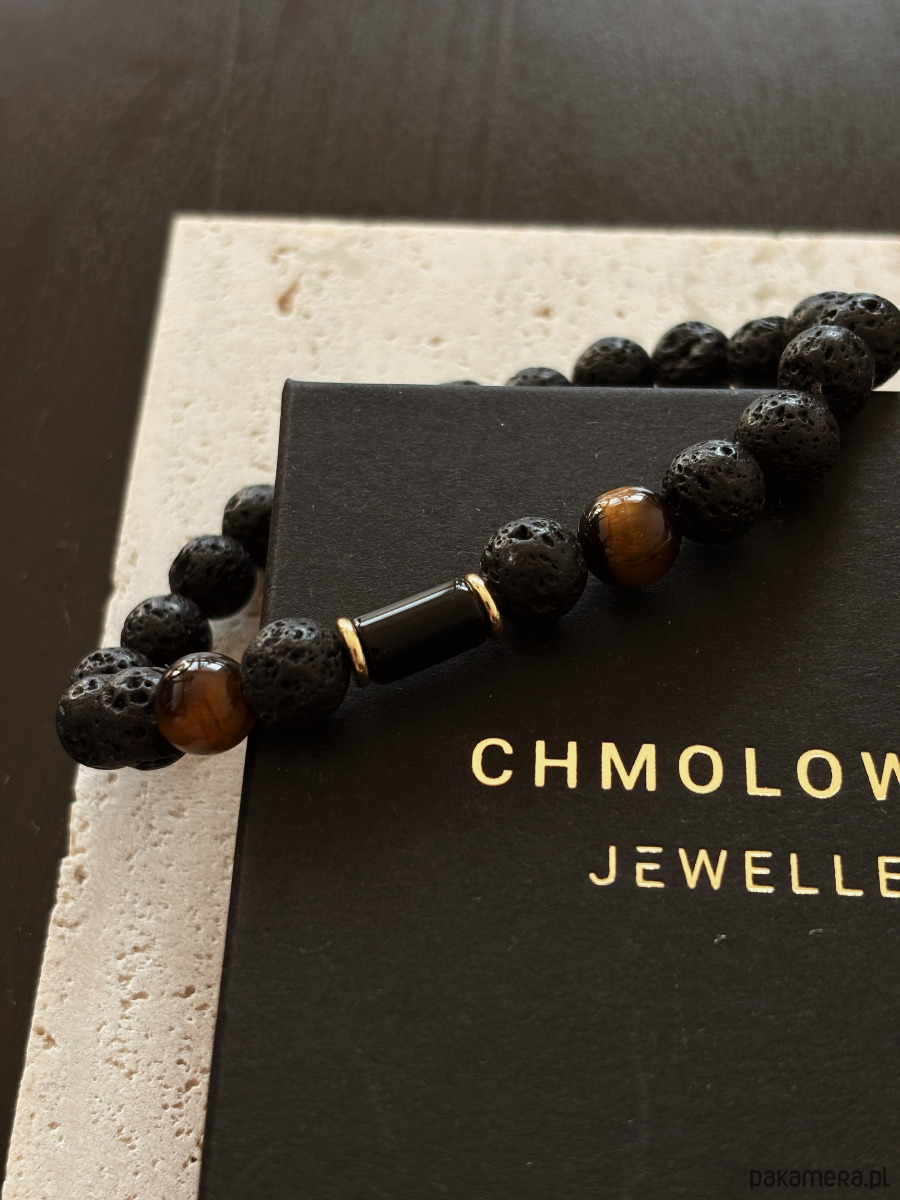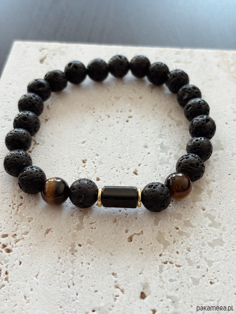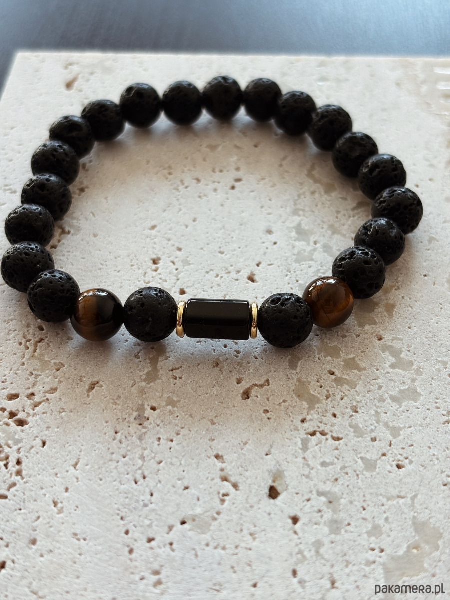 Bransoletka wykonana jest na gumce elastycznej z kamieni Lawy Wulkanicznej, Tygrysiego Oka i Turmalinu czarnego.