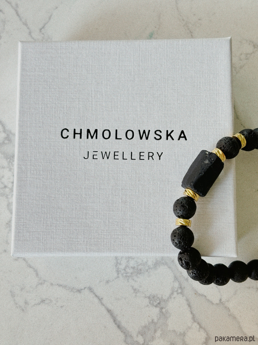 Bransoletka wykonana jest na gumce jubilerskiej z użyciem kamieni lawy, turmalinu surowego oraz pozłacanych przekładek.