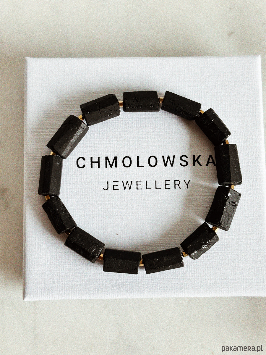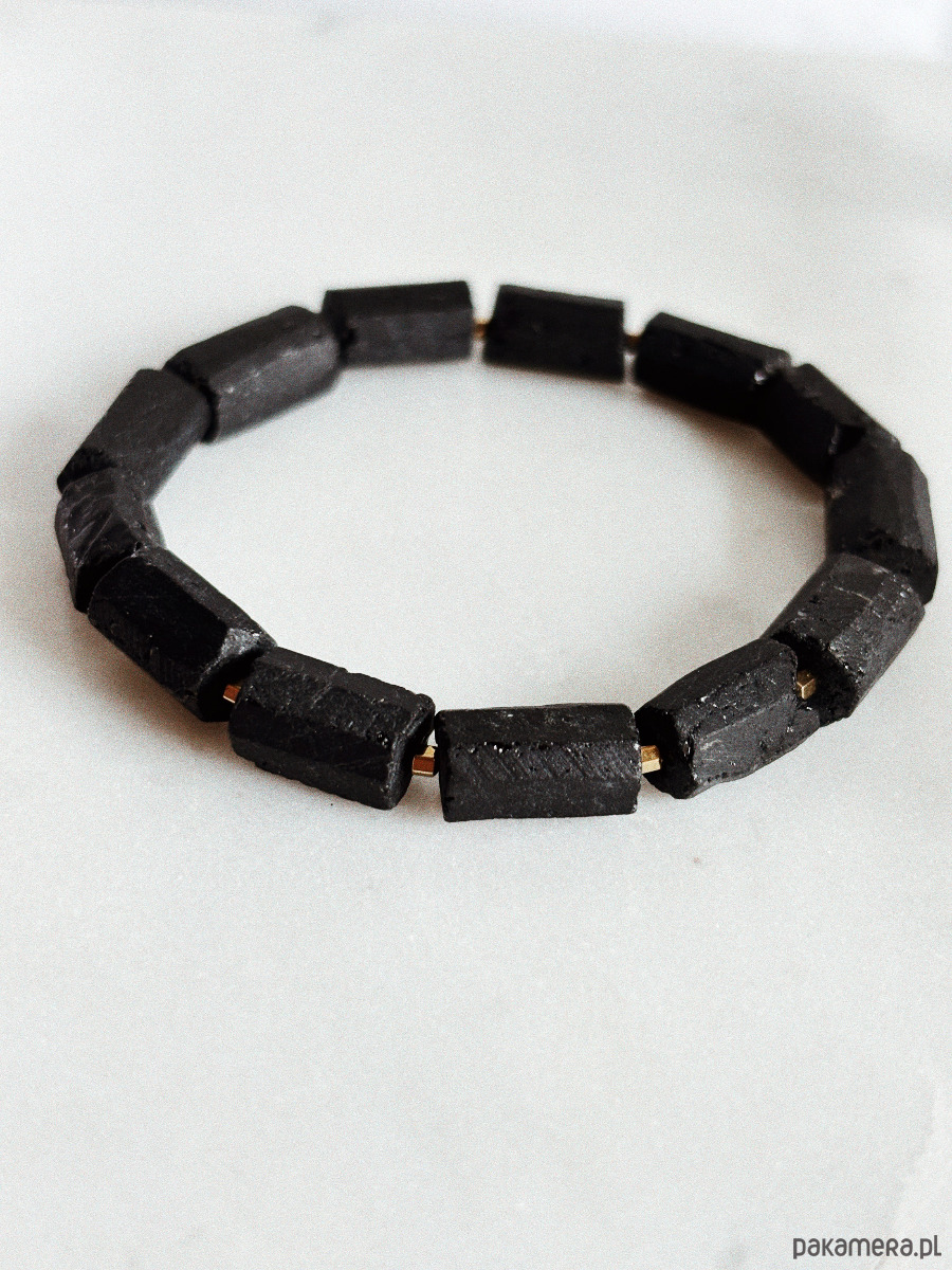 Bransoletka męska zrobiona została na gumce jubilerskiej z użyciem wysokiej jakości surowych turmalinów oraz pozłacanych przekładek.