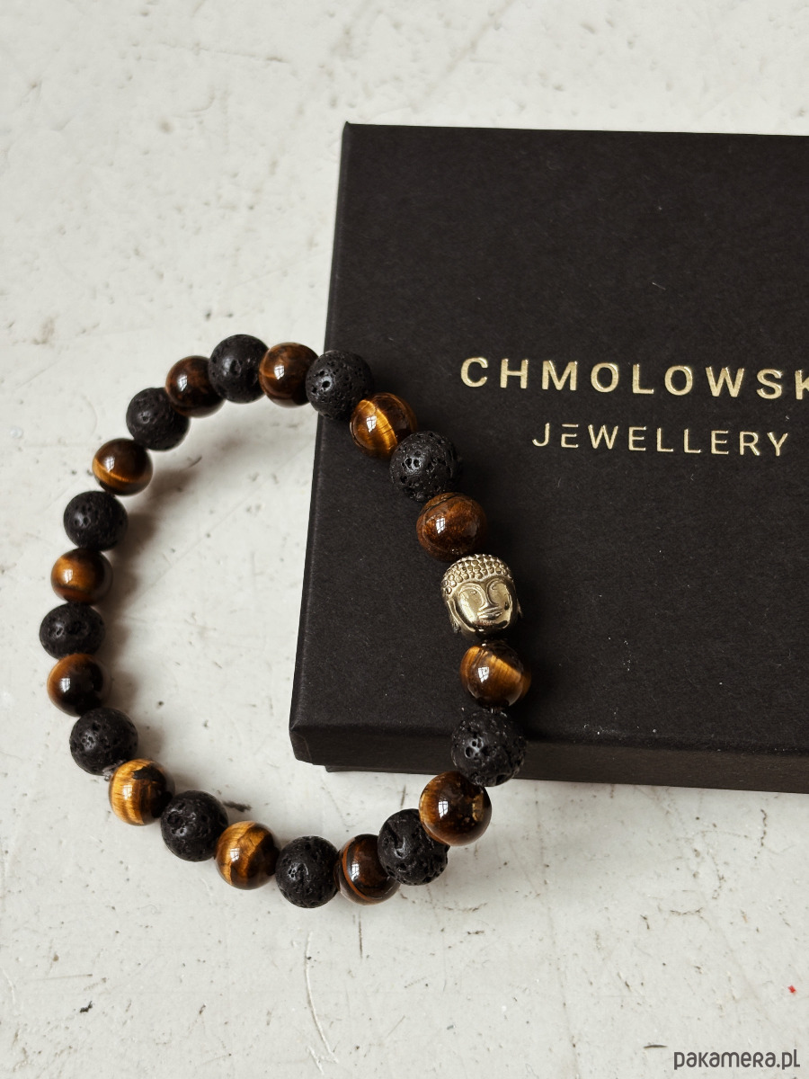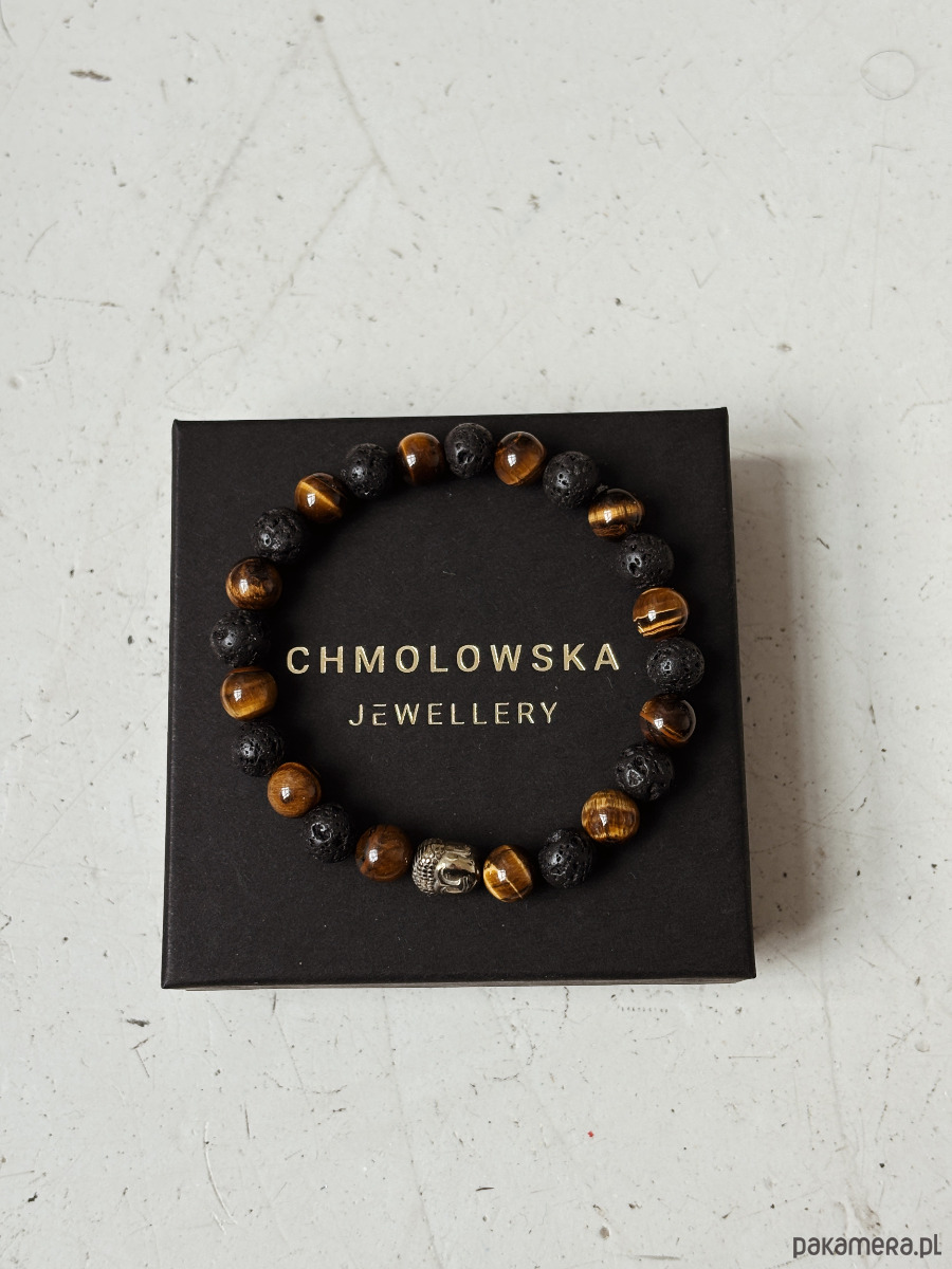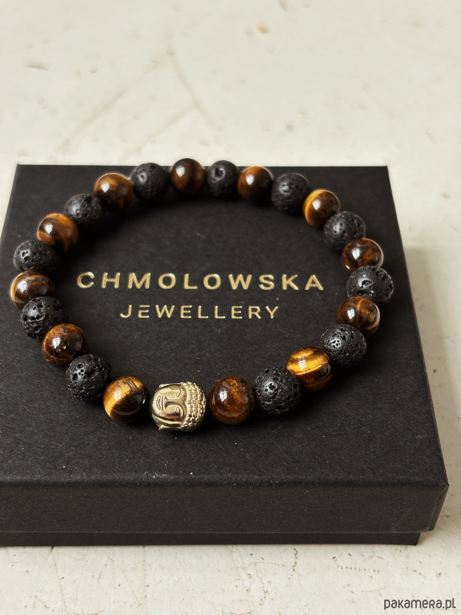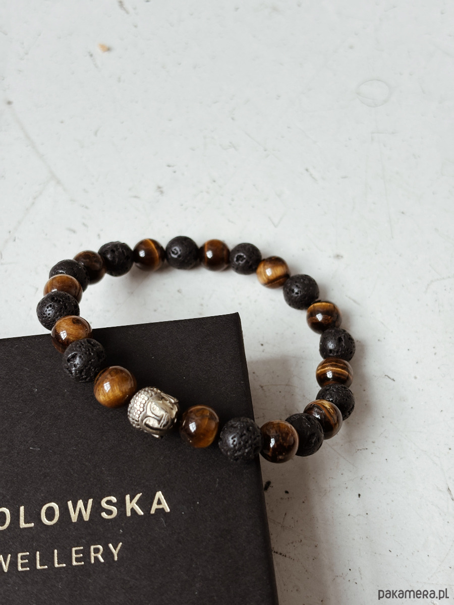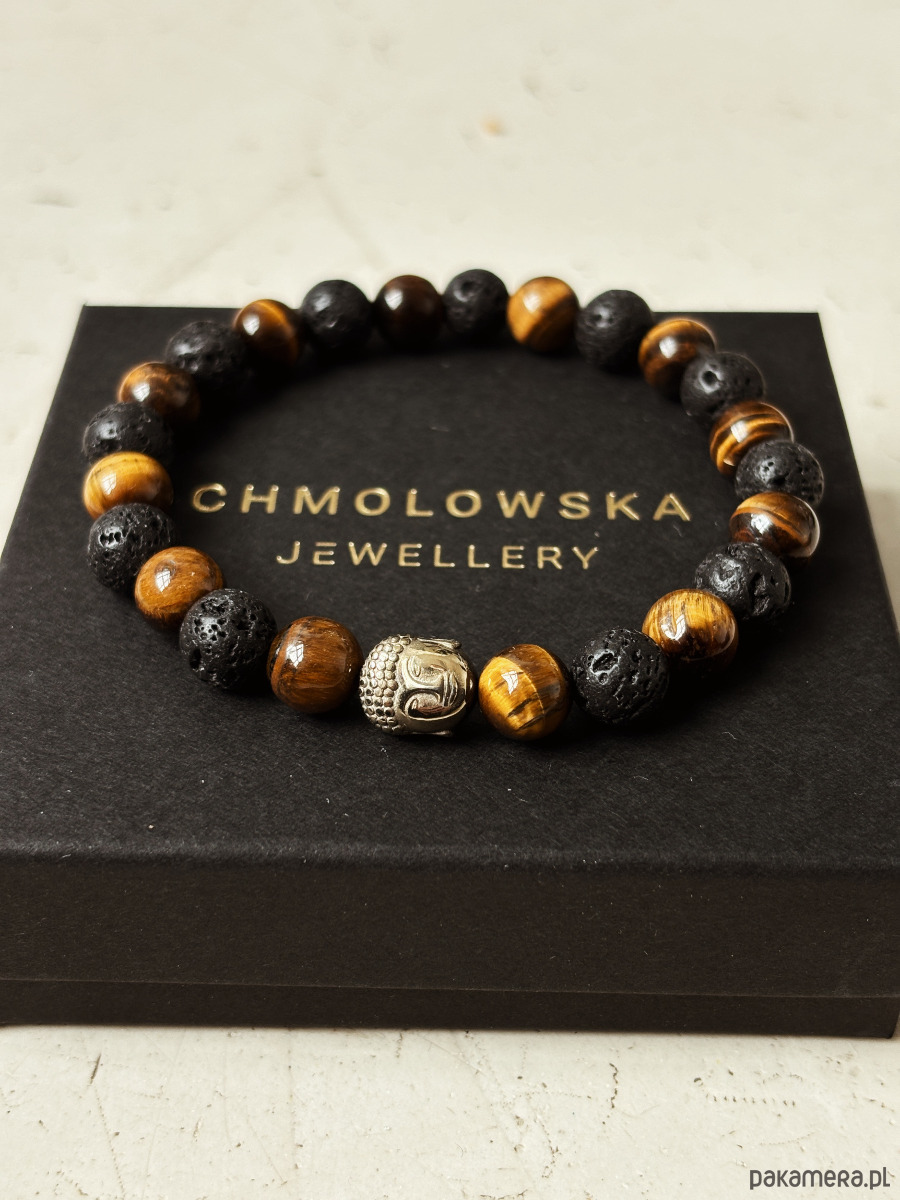 Bransoletka wykonana jest na gumce jubilerskiej z kamieni Lawy Wulkanicznej i Tygrysiego Oka, oraz przekładki Budda.