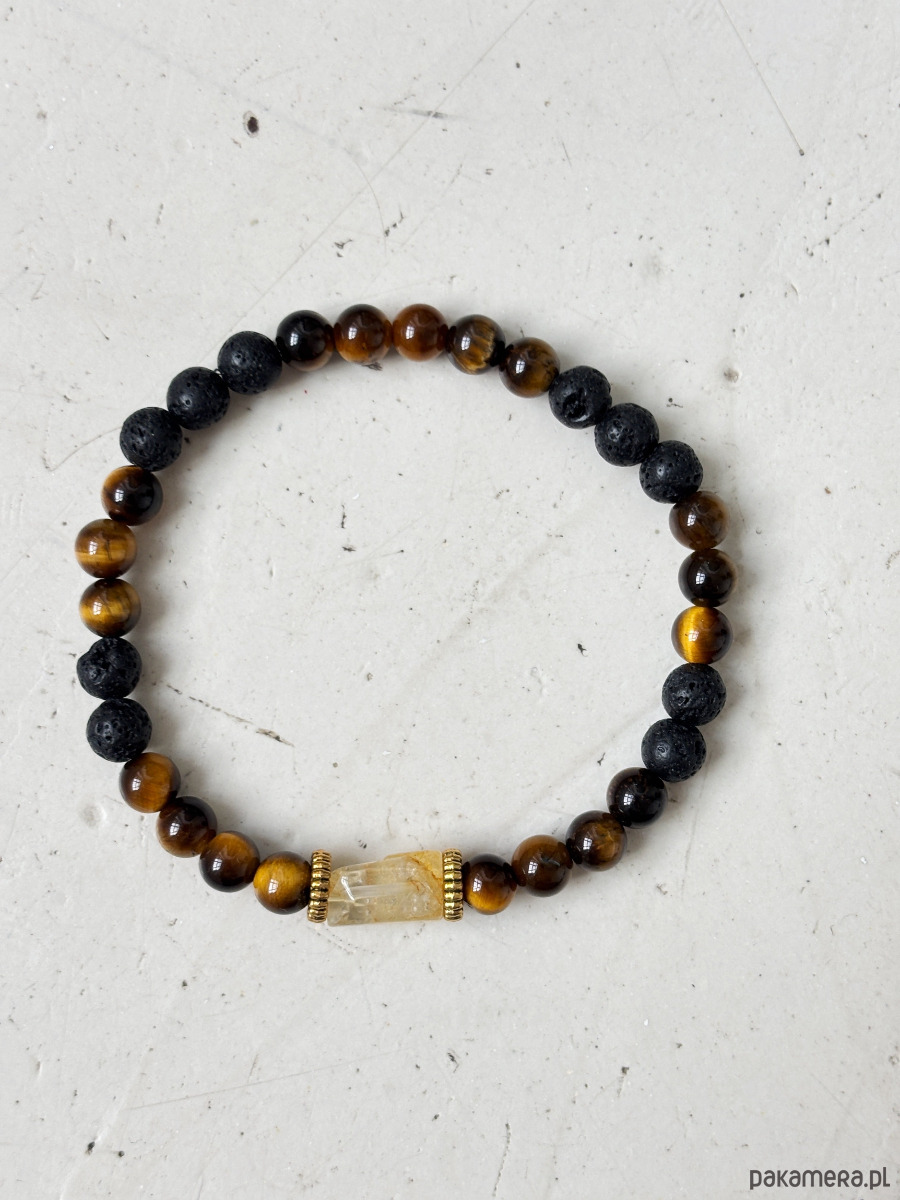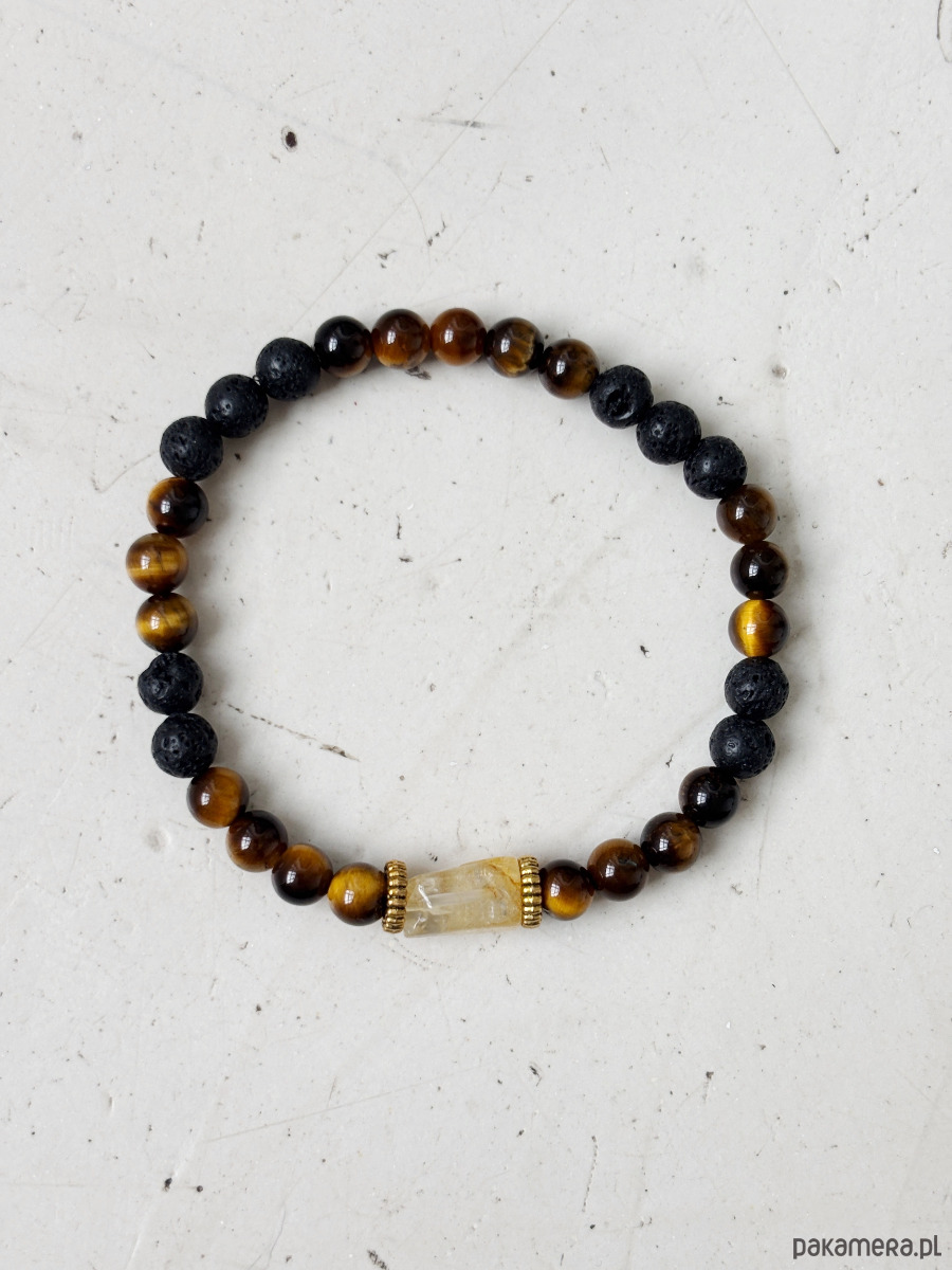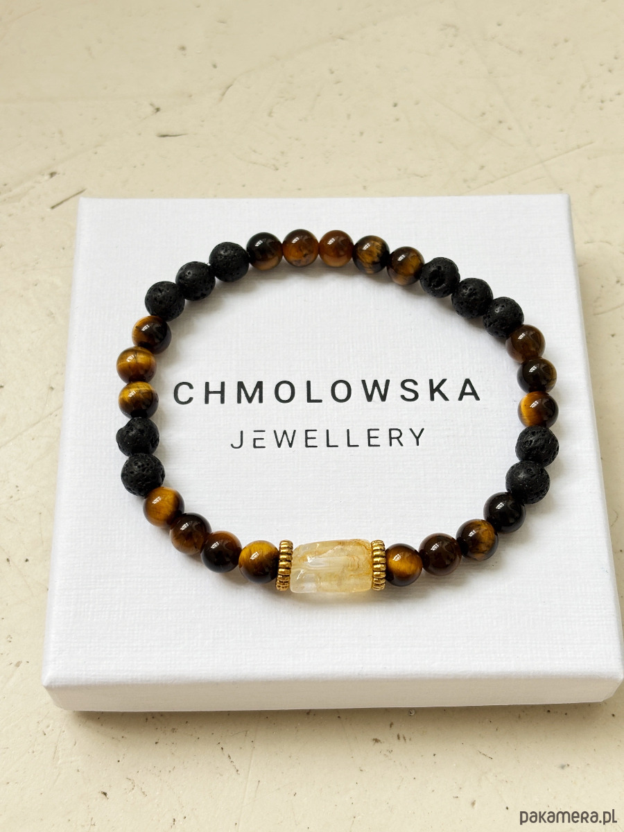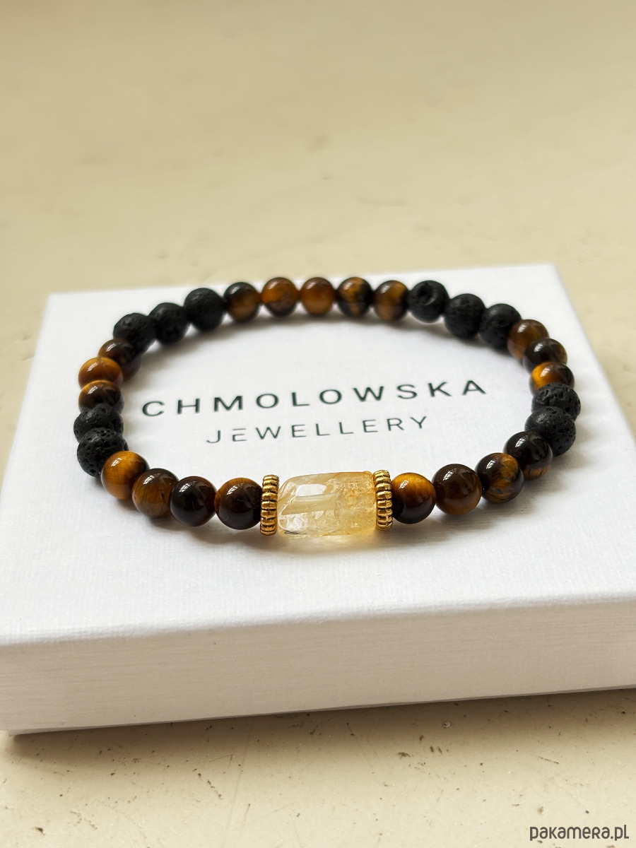 Bransoletka wykonana jest na gumce jubilerskiej, z użyciem lawy, tygrysiego oka i surowej bryły cytrynu, a także pozłacanych przekładek.