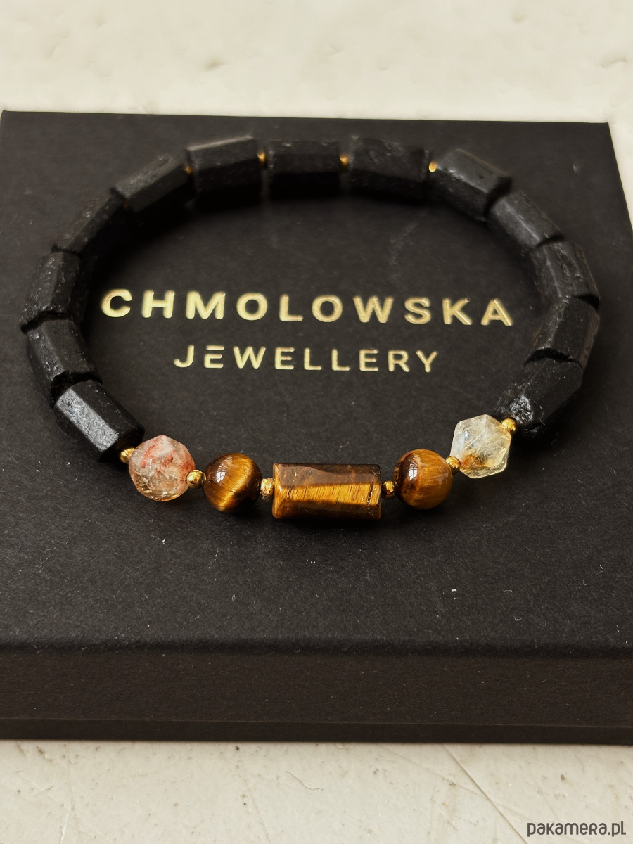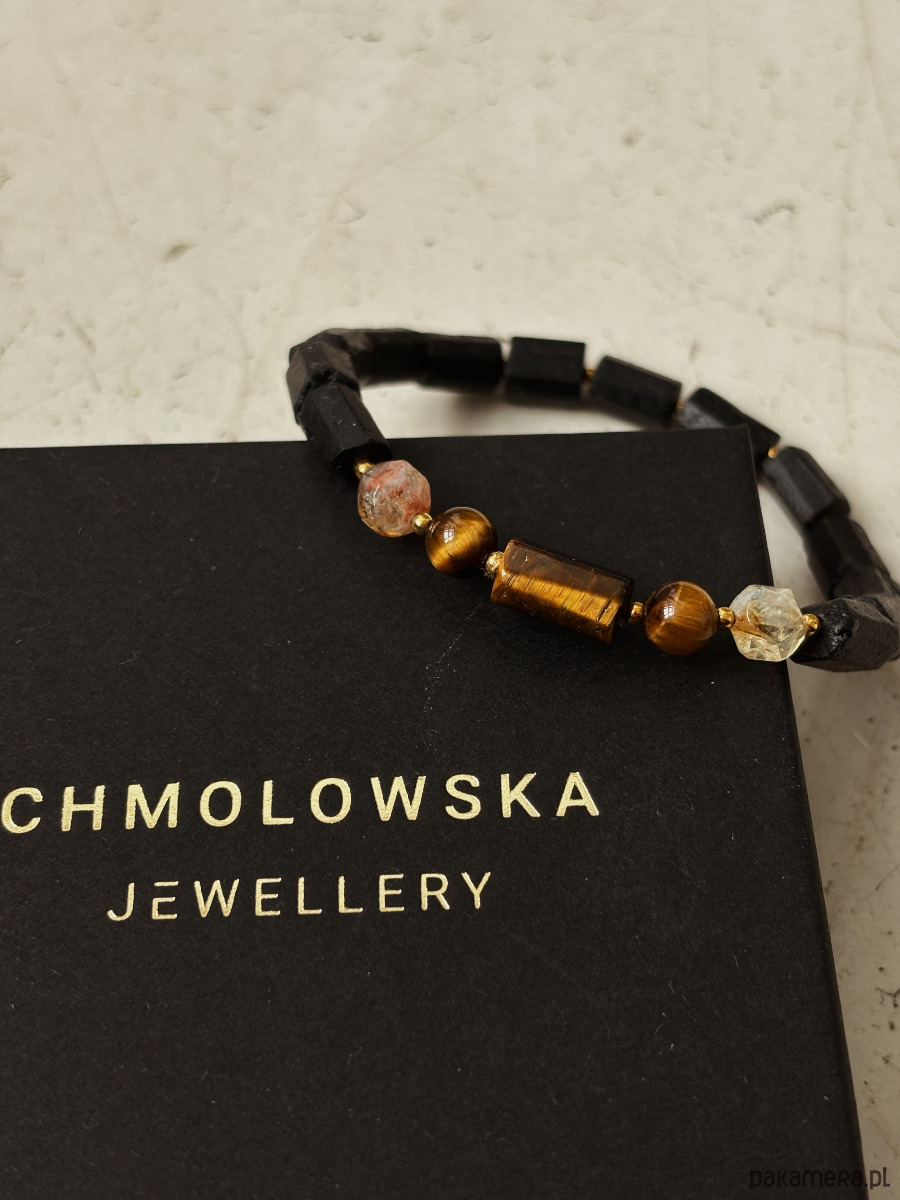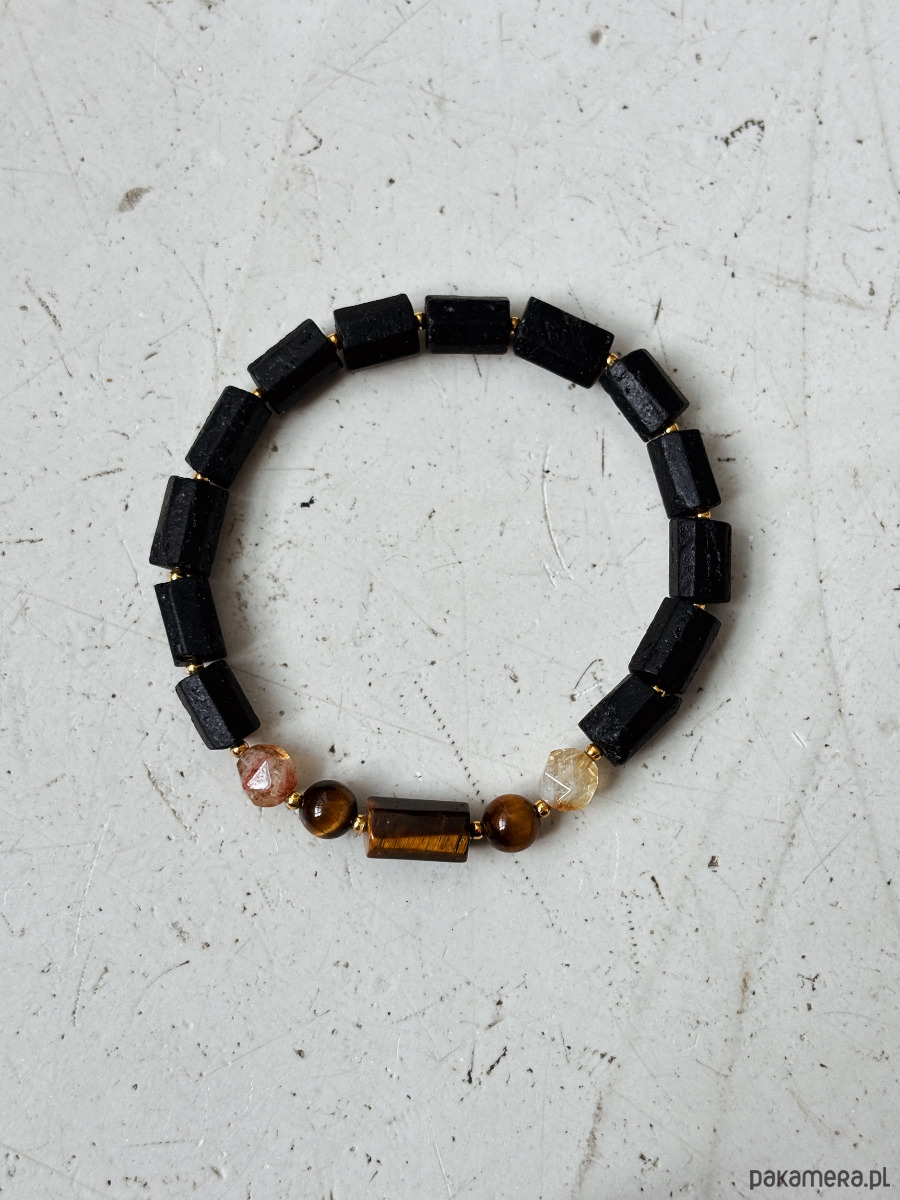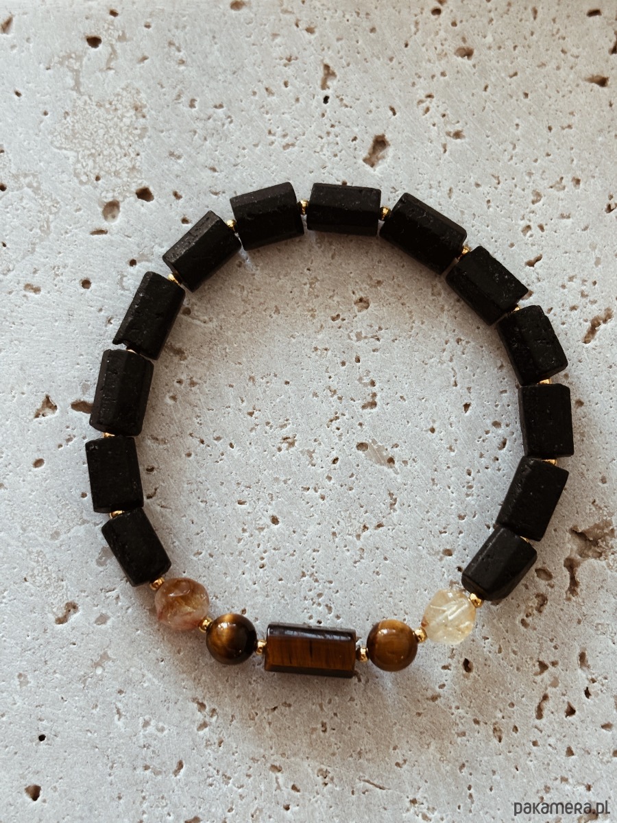 Bransoletka wykonana jest na gumce jubilerskiej z kamieni Turmalinu, Cytrynu i Tygrysiego Oka.