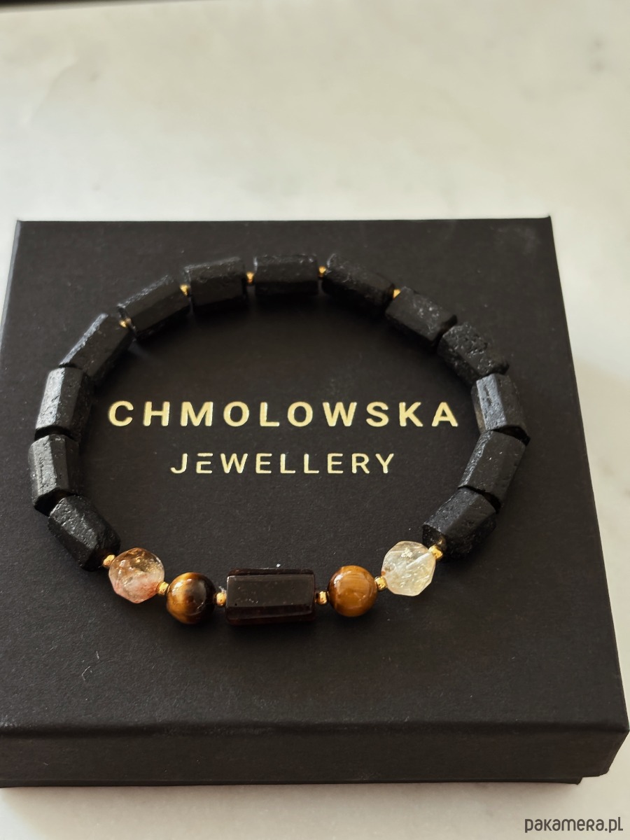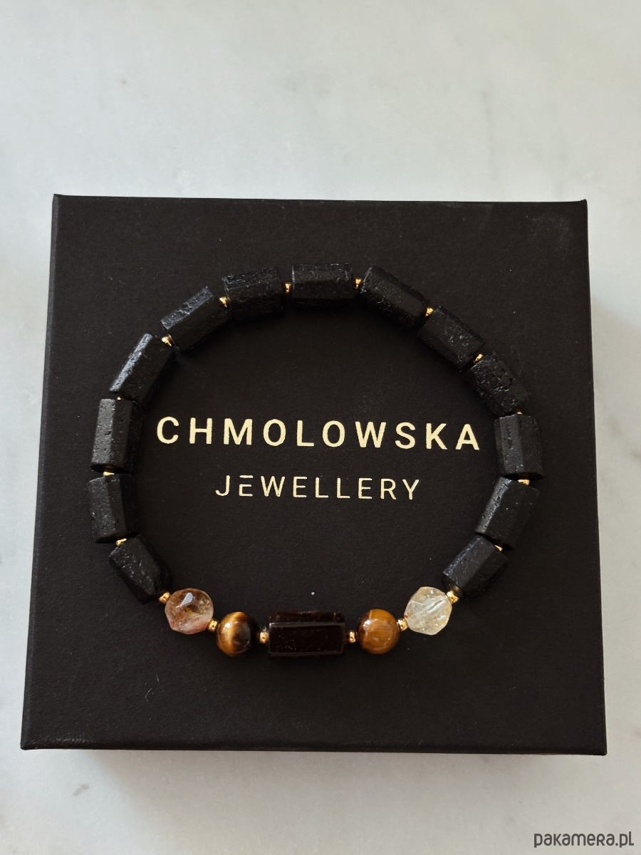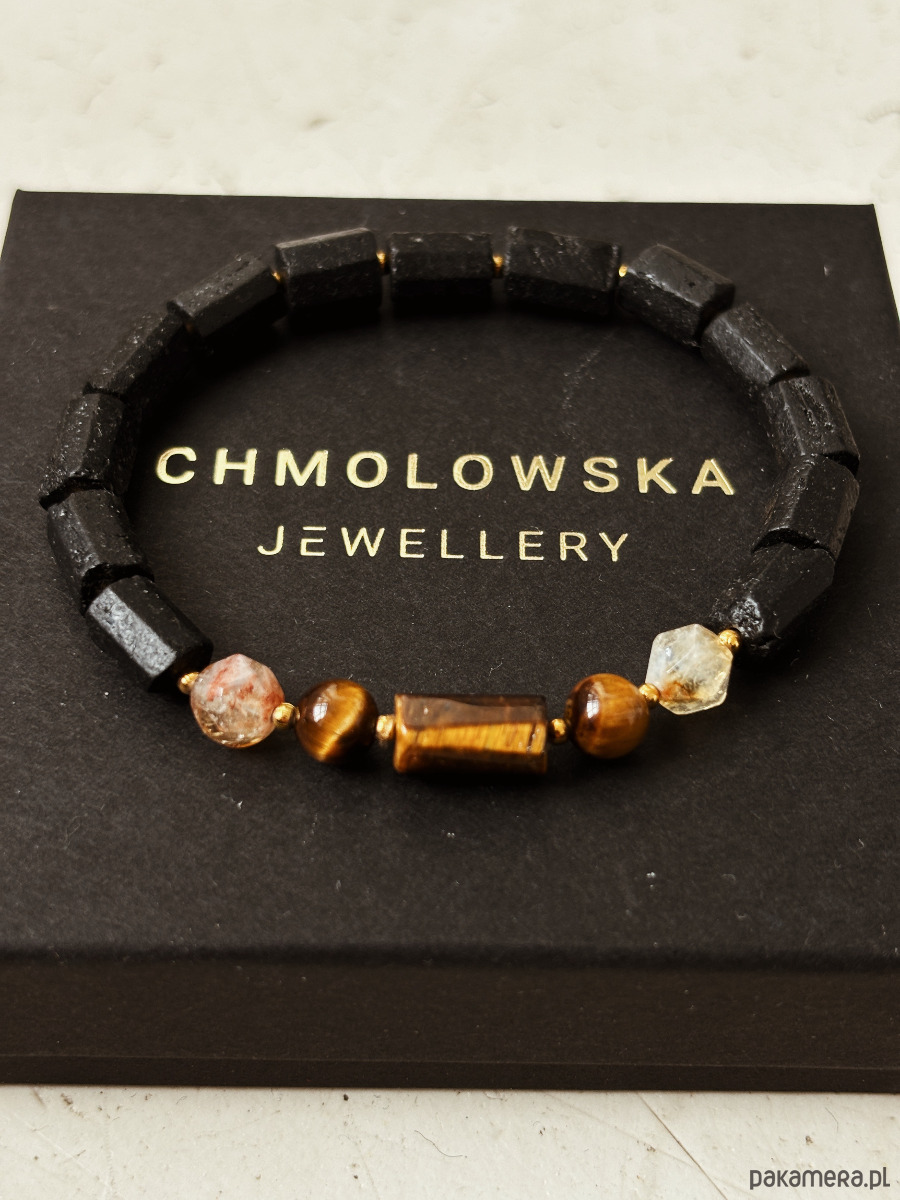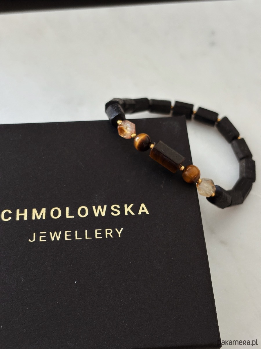 Bransoletka wykonana jest na gumce jubilerskiej z kamieni Turmalinu, Cytrynu i Tygrysiego Oka.