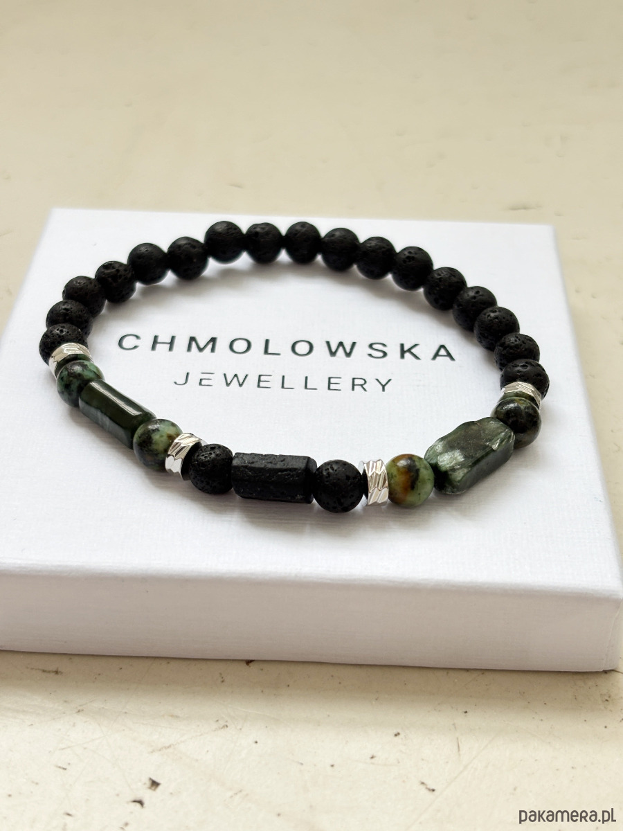 Bransoletka wykonana zostaała z kamieni serpentynit, bryły serafnitu a także turmalinu i srebrnych przekładek.