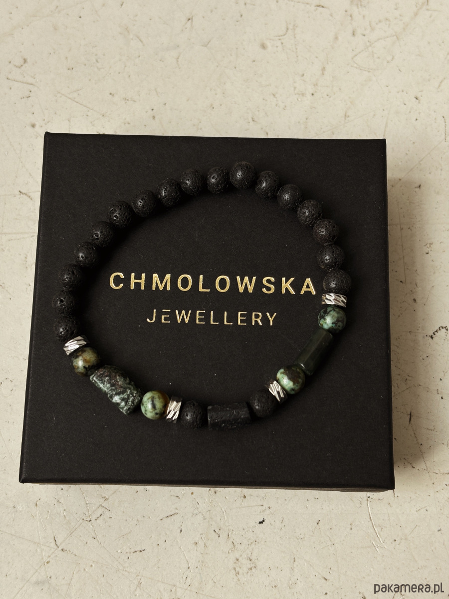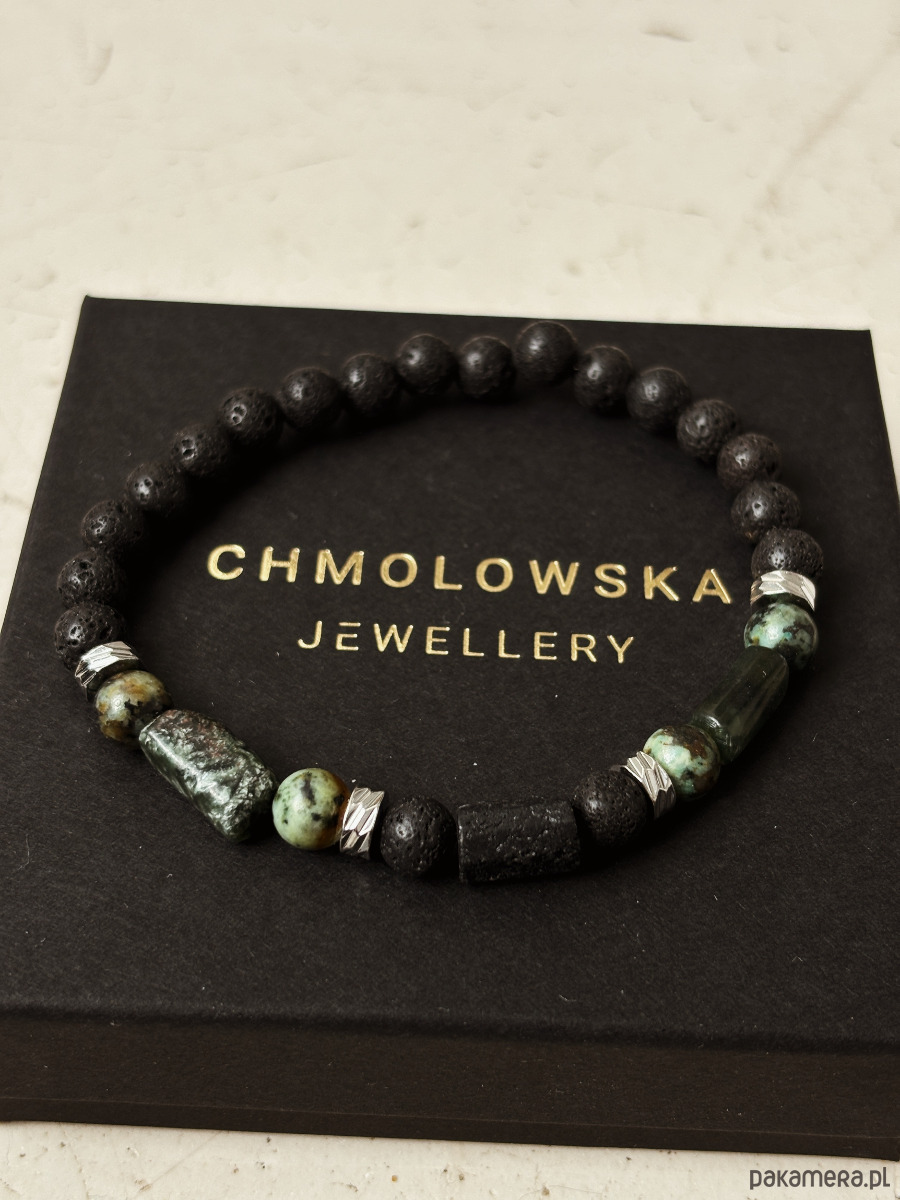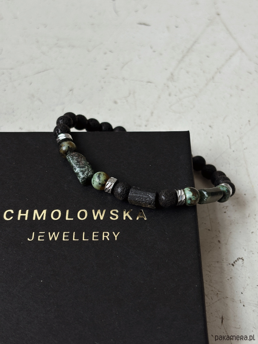 Bransoletka wykonana została na gumce jubilerskiej z kamieni Serpentynitu, brył Serafnitu a także Turmalinu i srebrnych przekładek.