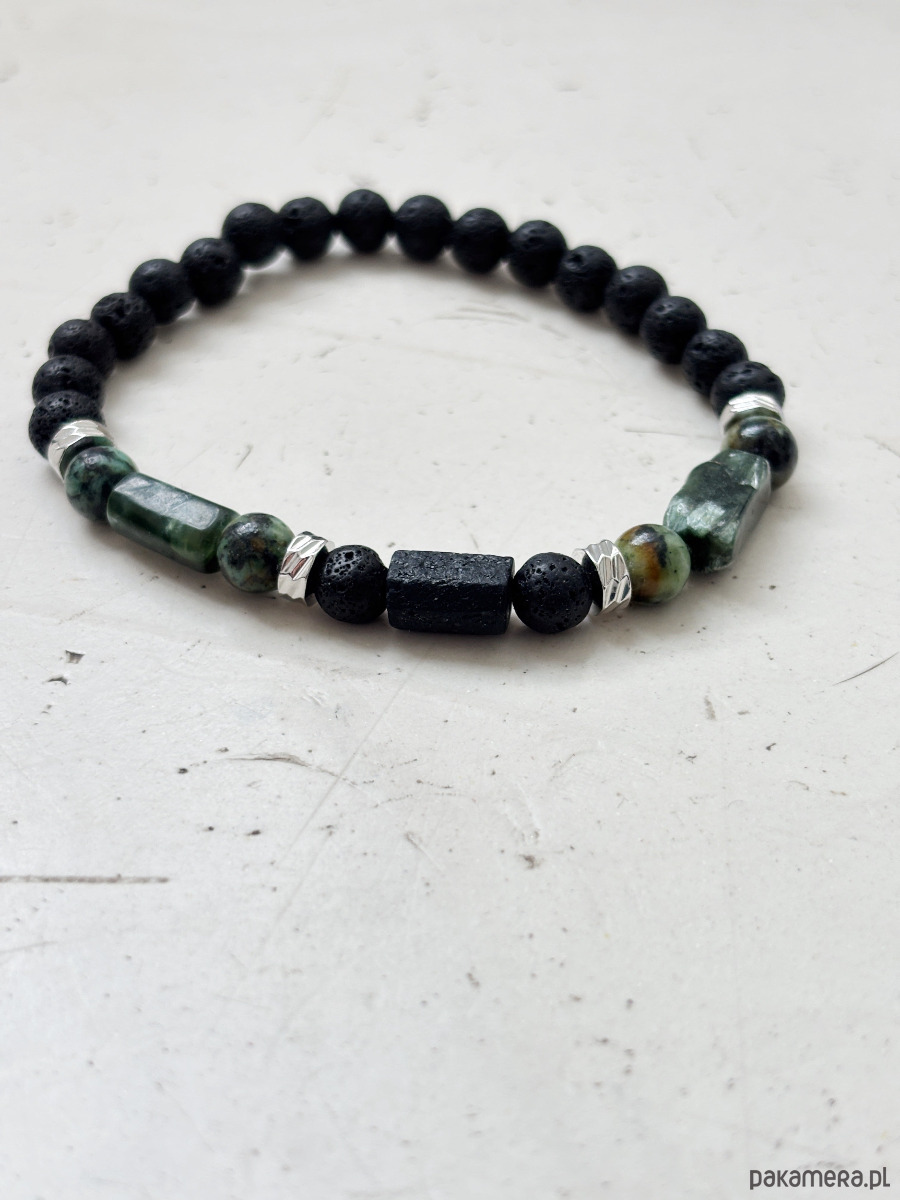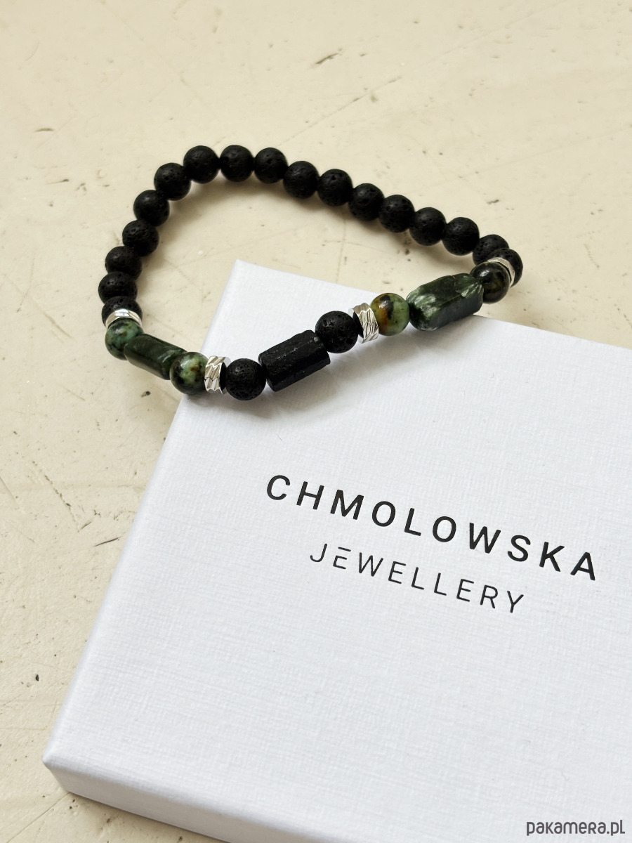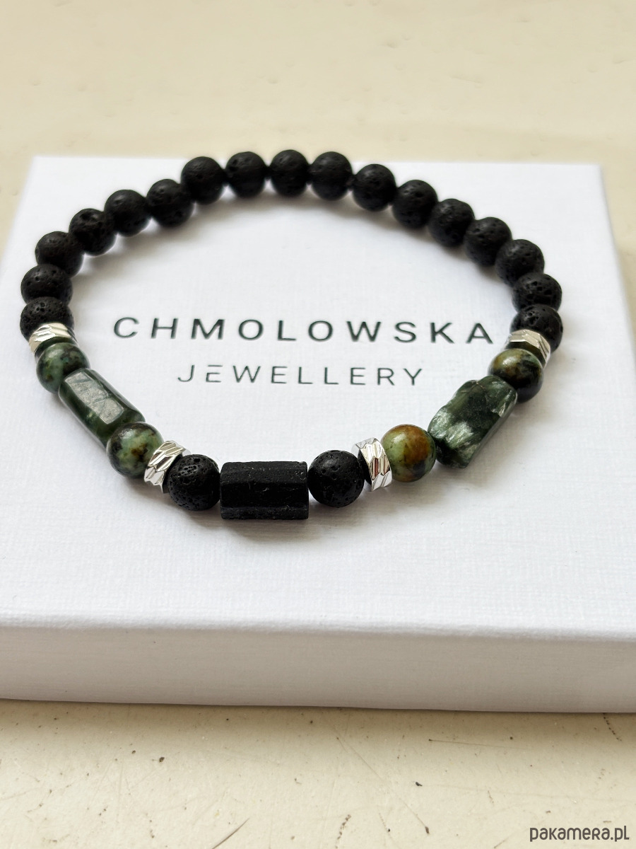 Bransoletka wykonana zostaała z kamieni serpentynit, bryły serafnitu a także turmalinu i srebrnych przekładek.