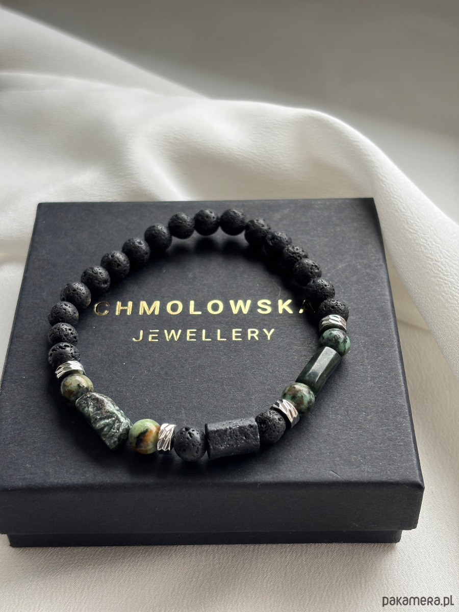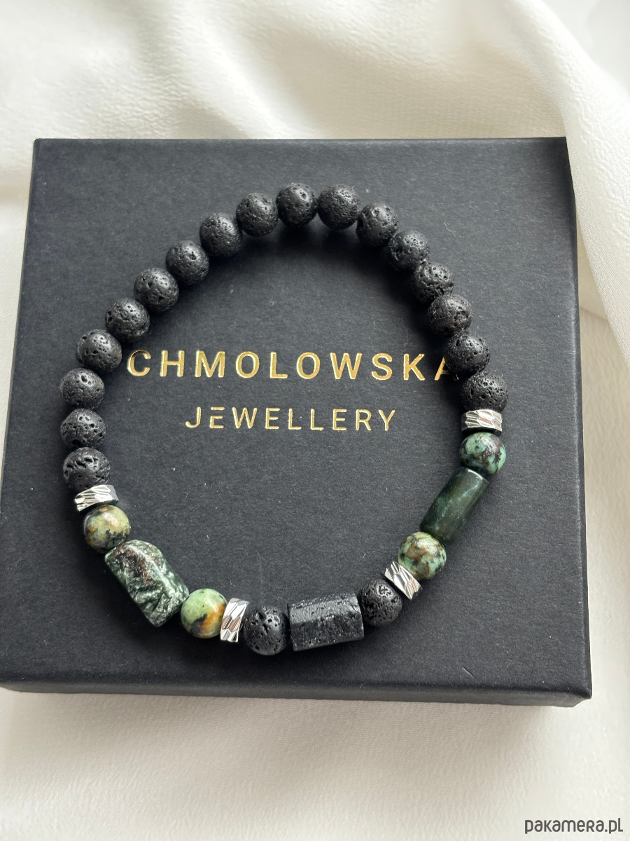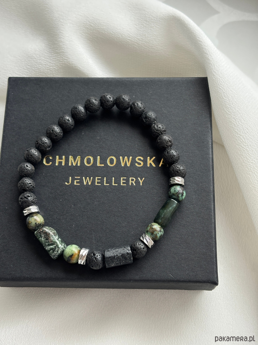 Bransoletka wykonana zostaała z kamieni serpentynit, bryły serafnitu a także turmalinu i srebrnych przekładek.