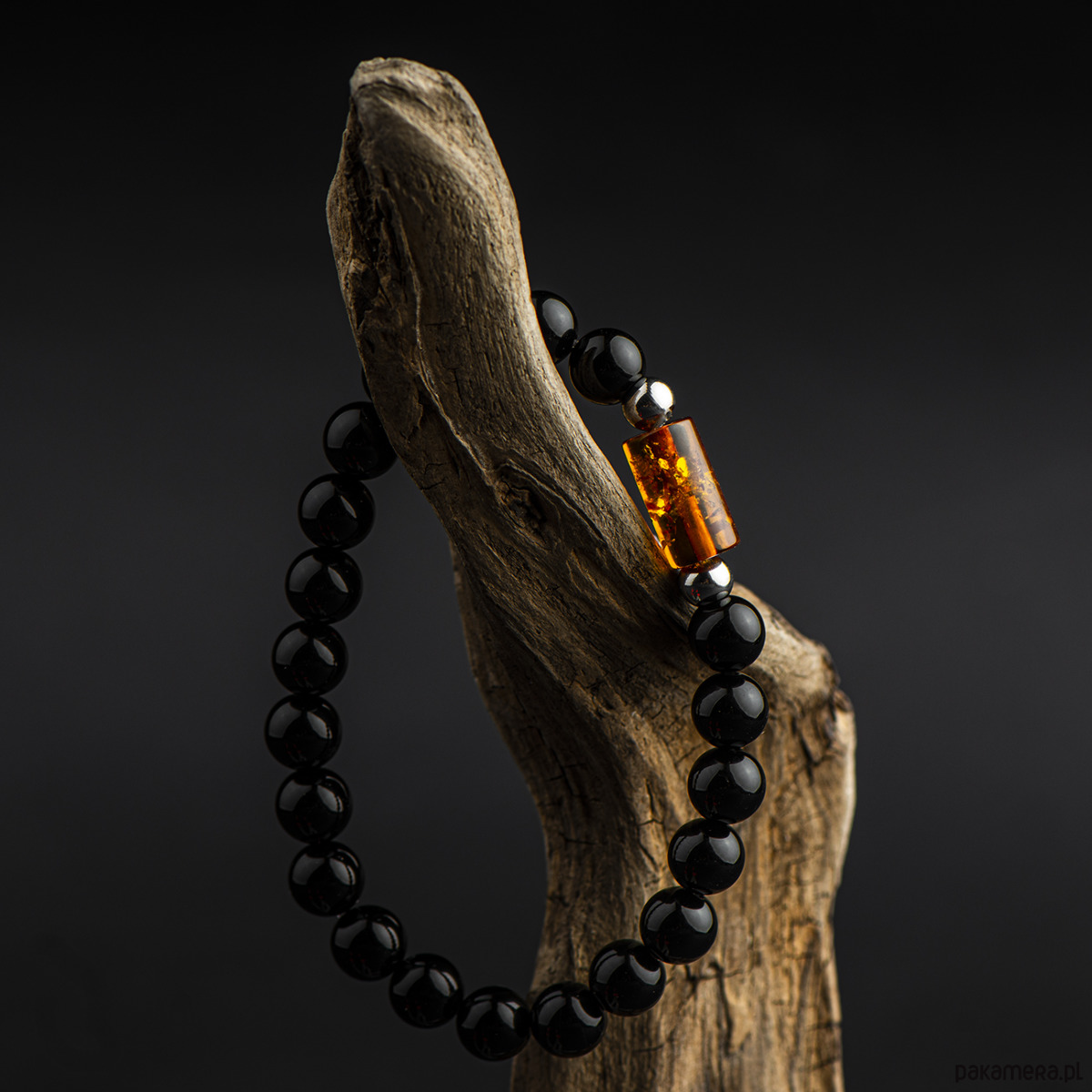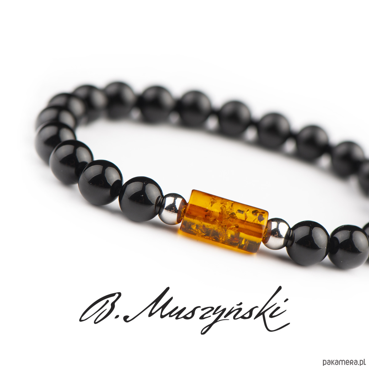 Bransoletka wykonana z kamieni onyksu oraz bursztynu bałtyckiego.