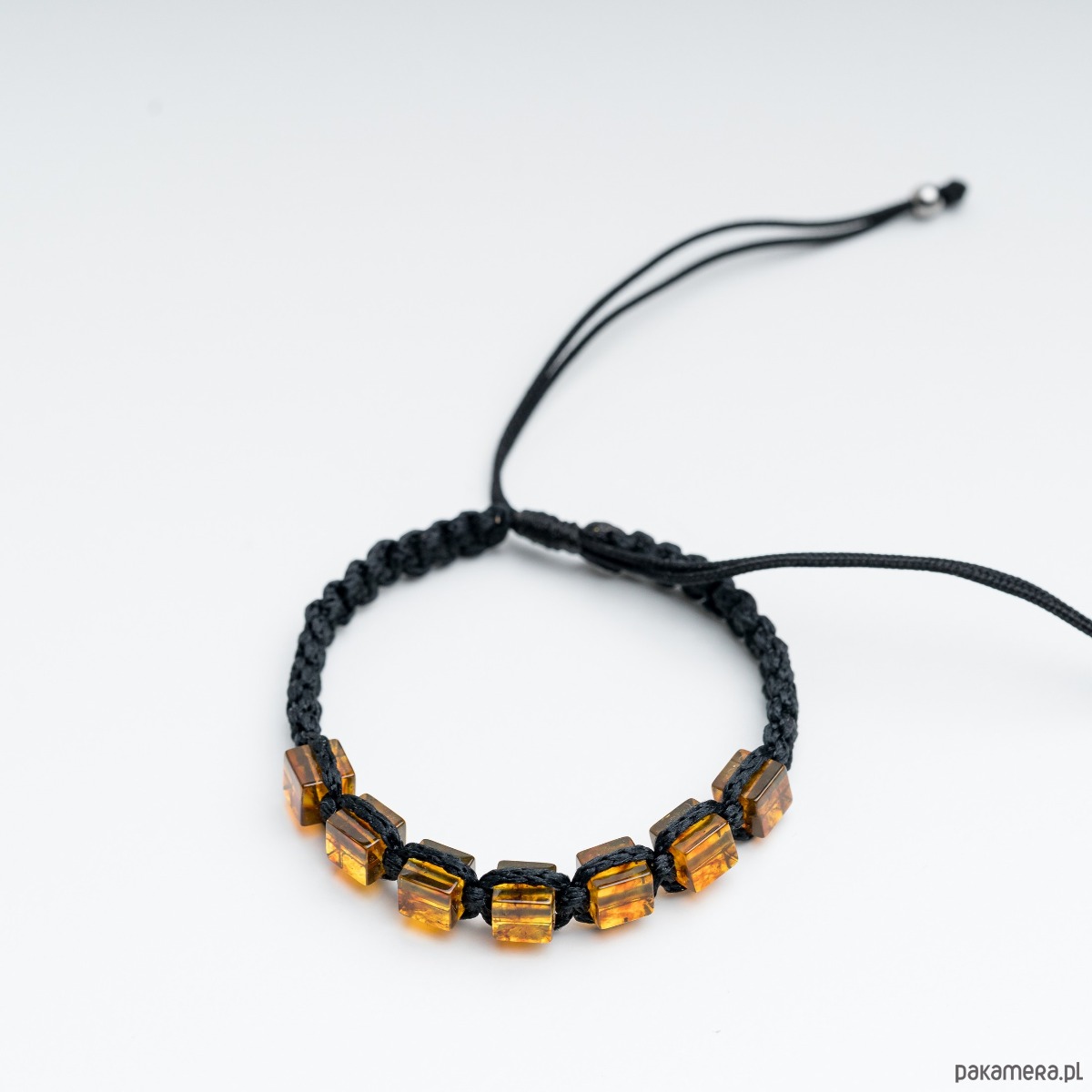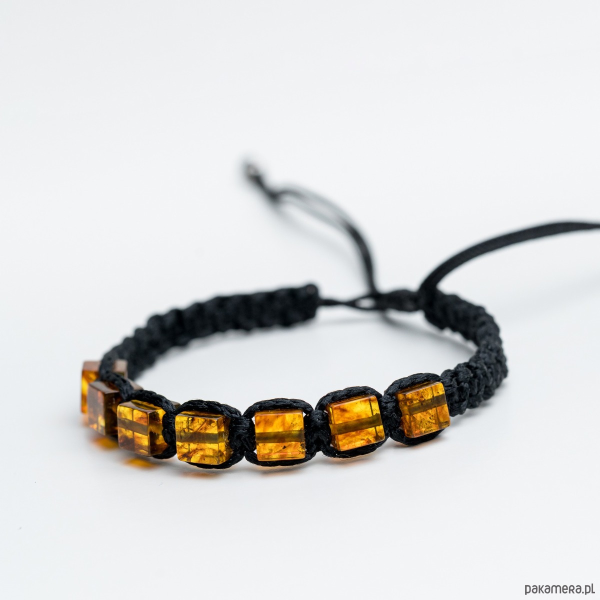 Minimalistyczna bransoletka męska wykonana z naturalnego bursztynu bałtyckiego w kolorze koniakowym. Bursztynowe koraliki w kształcie kostekl tworzą spójną, elegancką kompozycję.