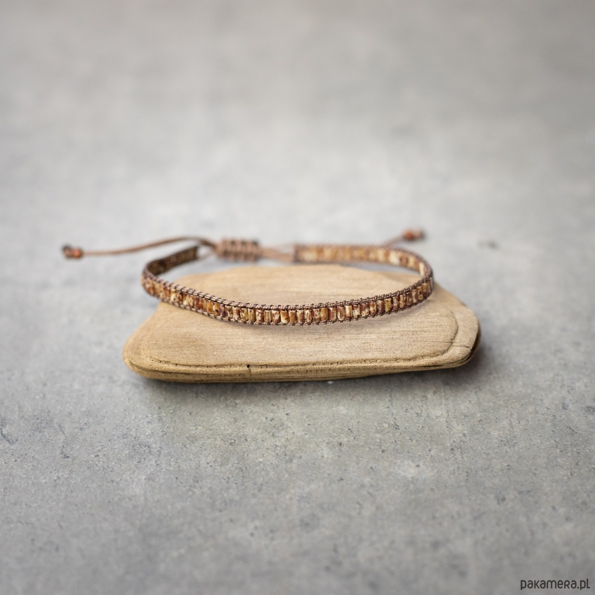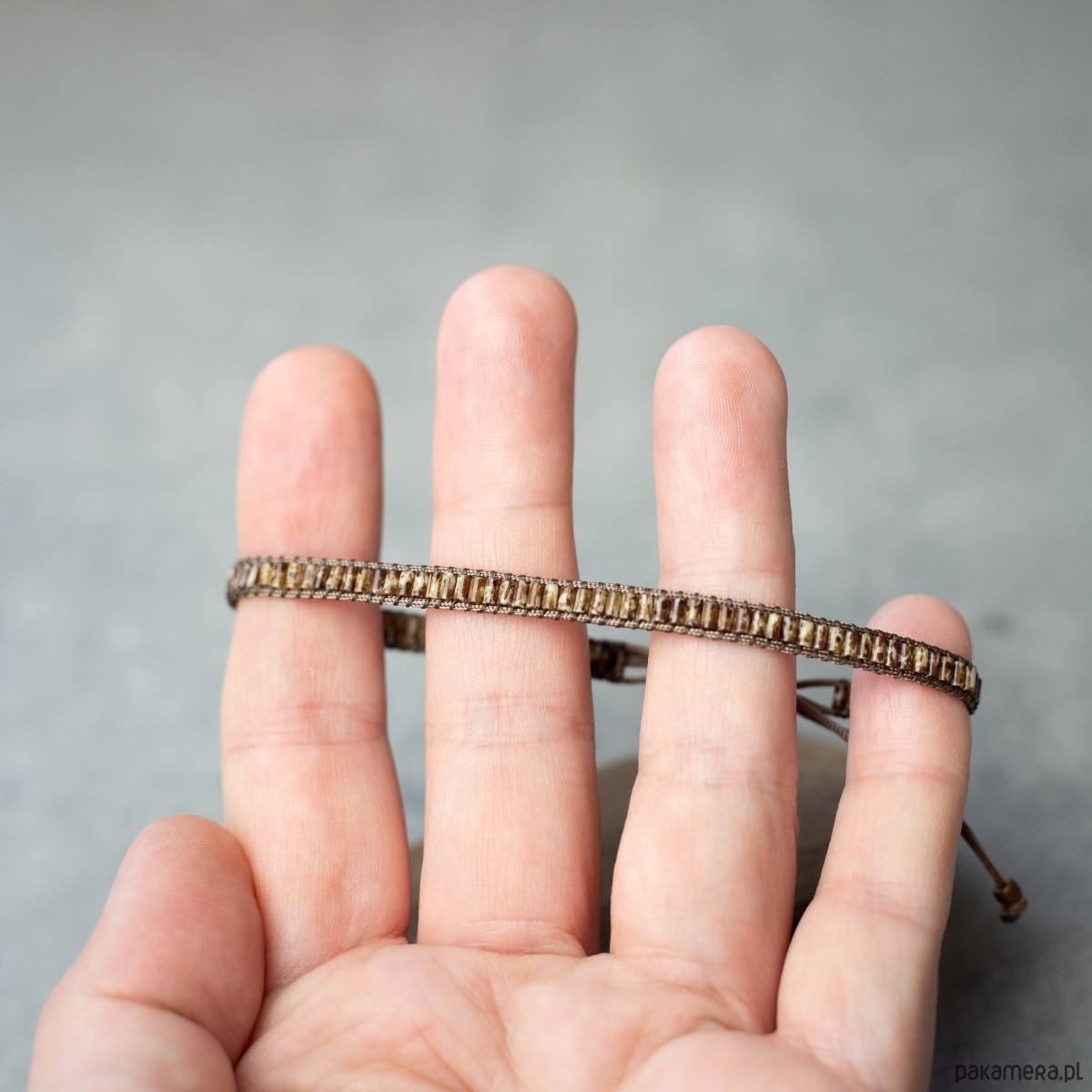 Bransoletka wykonana z koralików szklanych Toho oraz Miyuki, nici i sznurka nylonowego. Kolory: brązowy, nakrapiany białym