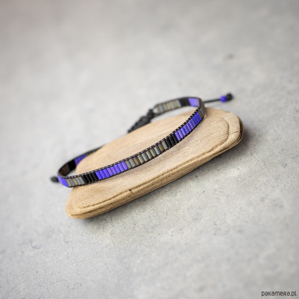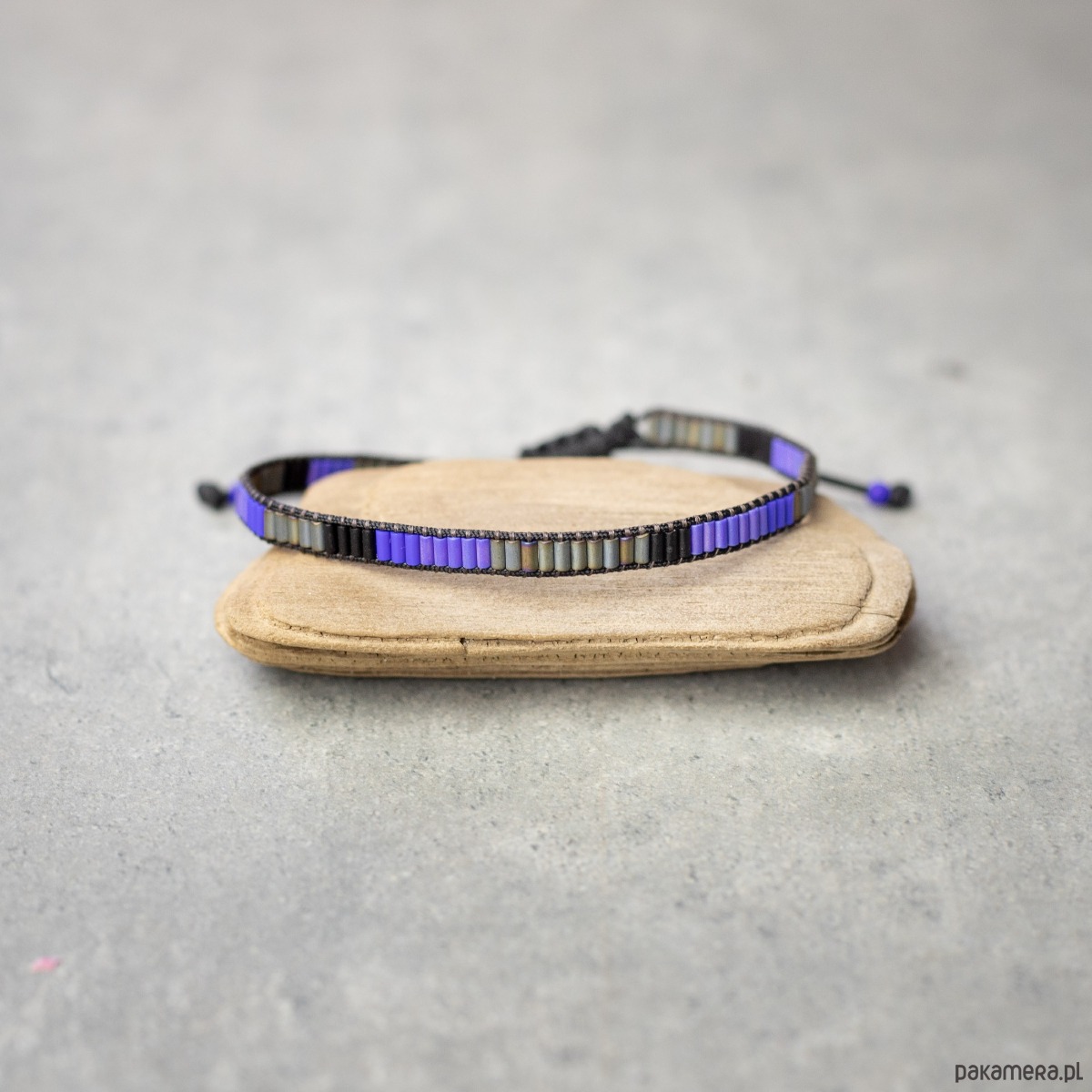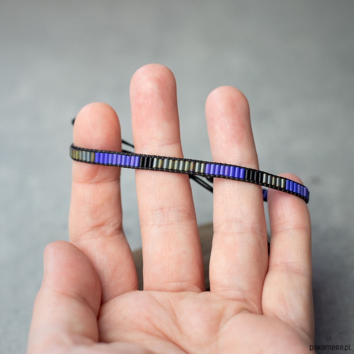 Bransoletka wykonana z koralików szklanych Toho oraz Miyuki, nici i sznurka nylonowego. Kolory: granatowy, szary, czarny