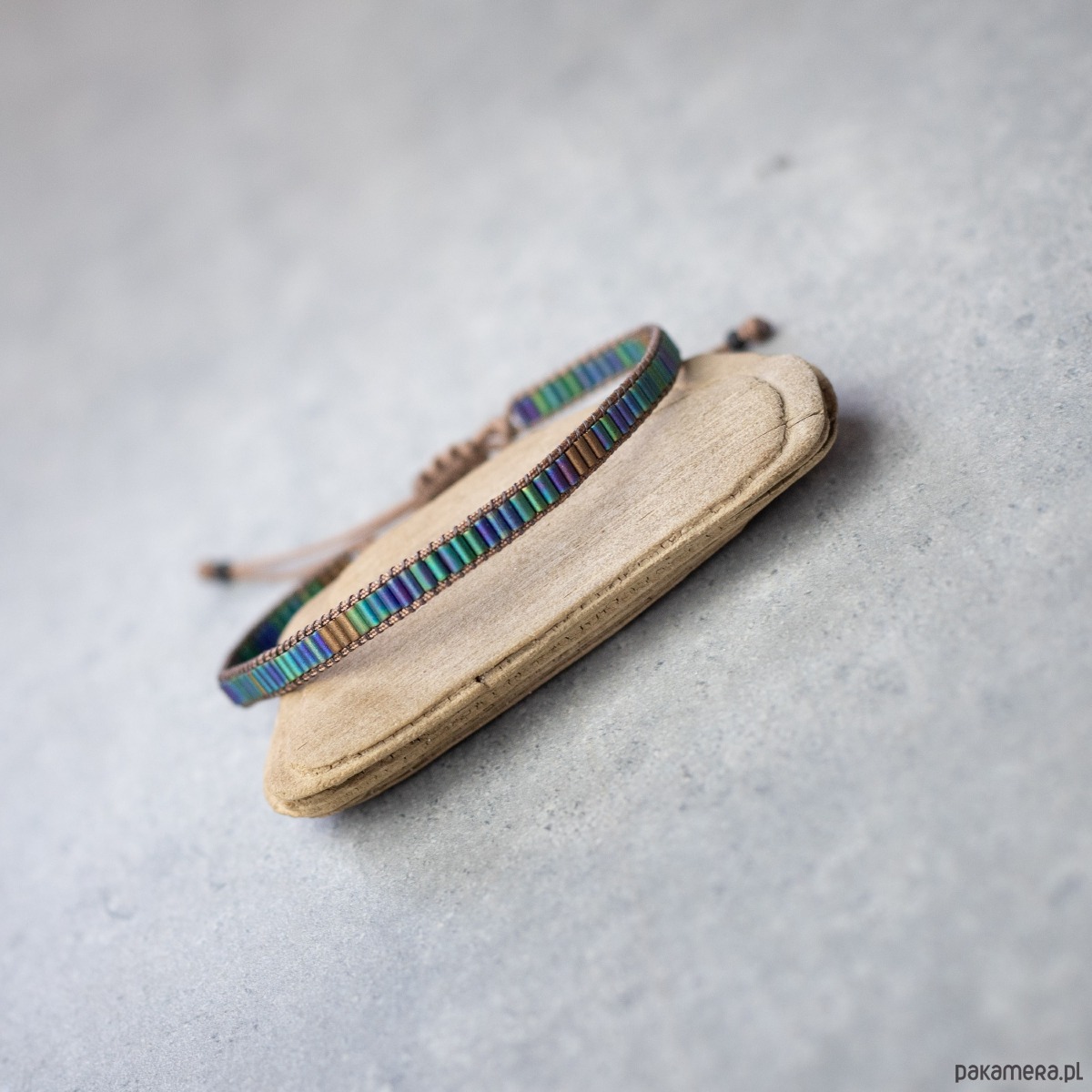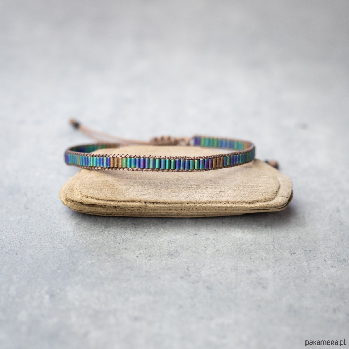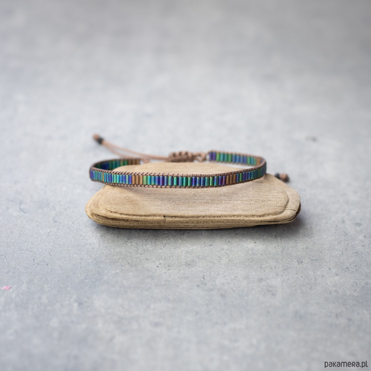 Bransoletka wykonana z koralików szklanych Toho oraz Miyuki, nici i sznurka nylonowego. Kolory: niebiesko-zielony, brązowy