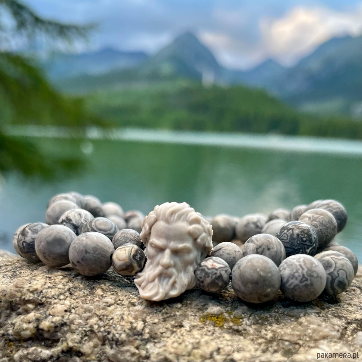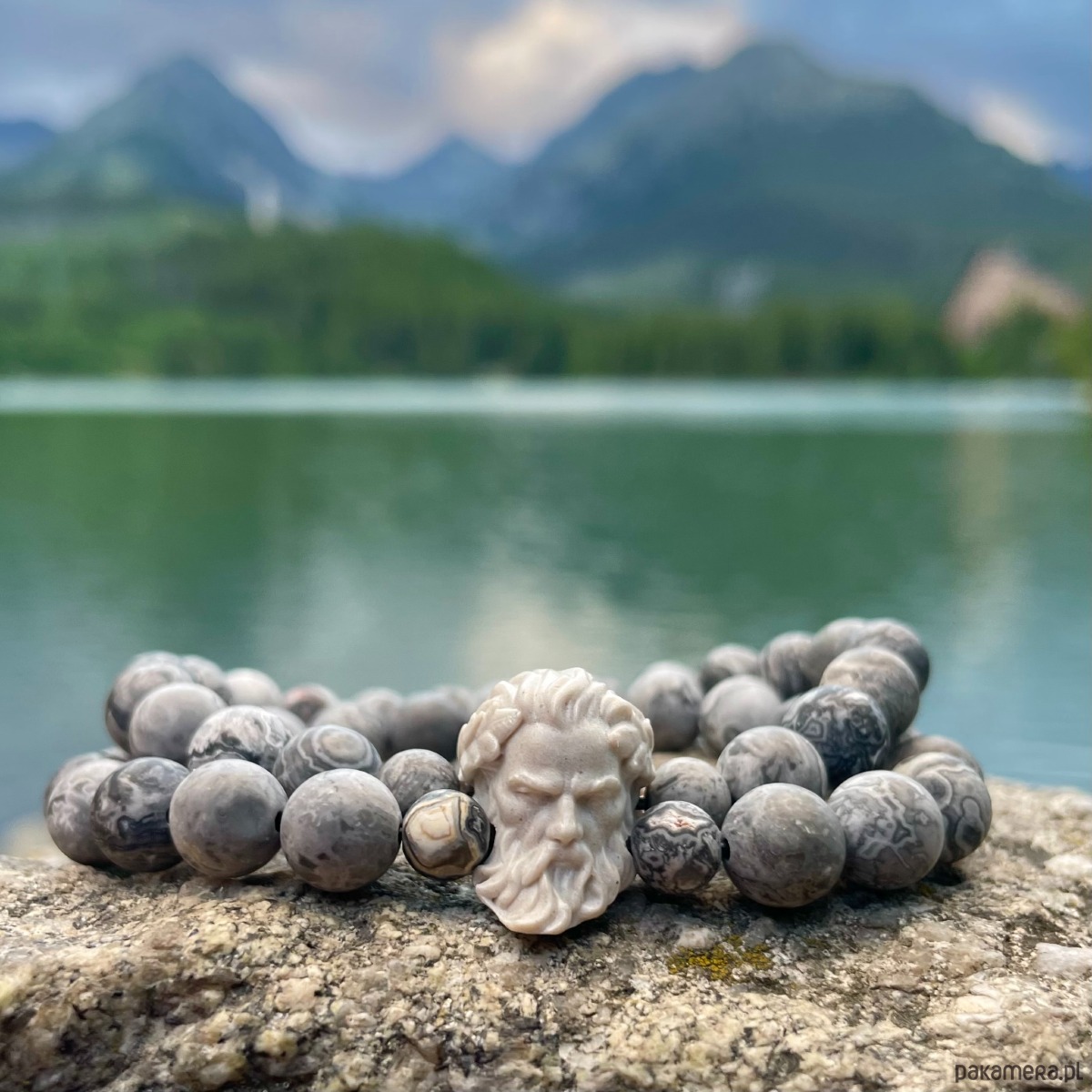 Stylowa bransoletka męska wykonana z naturalnych kamieni szarego jaspisu, uzupełniona detalem w formie głowy Zeusa wykonanej z wysokiej jakości materiału kompozytowego o strukturze przypominającej kamień.