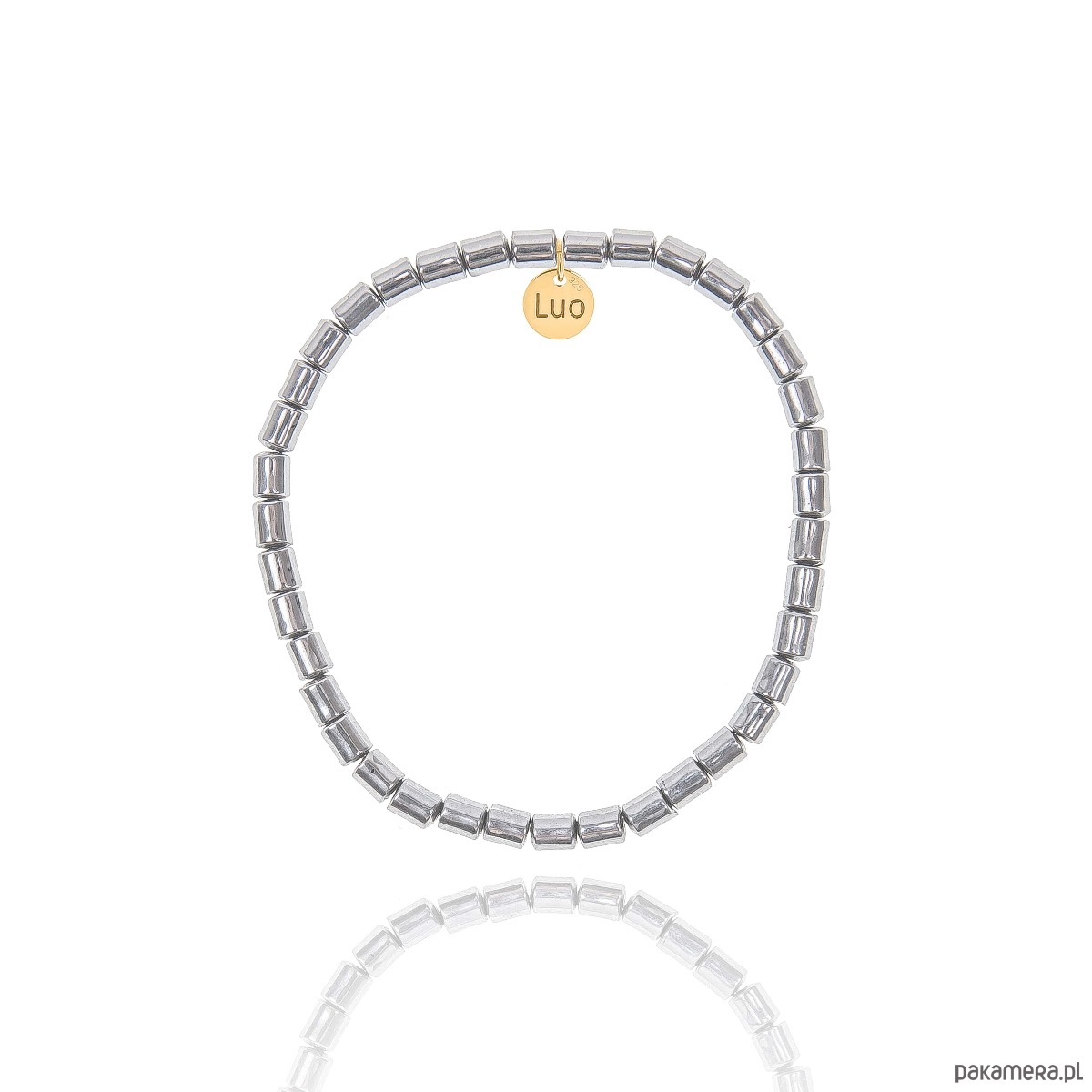 Bransoletka męska ze srebrnego hematytu w kształcie walca. Logo zrobione ze srebra 925 pokrytego 24 karatowym żółtym złotem.