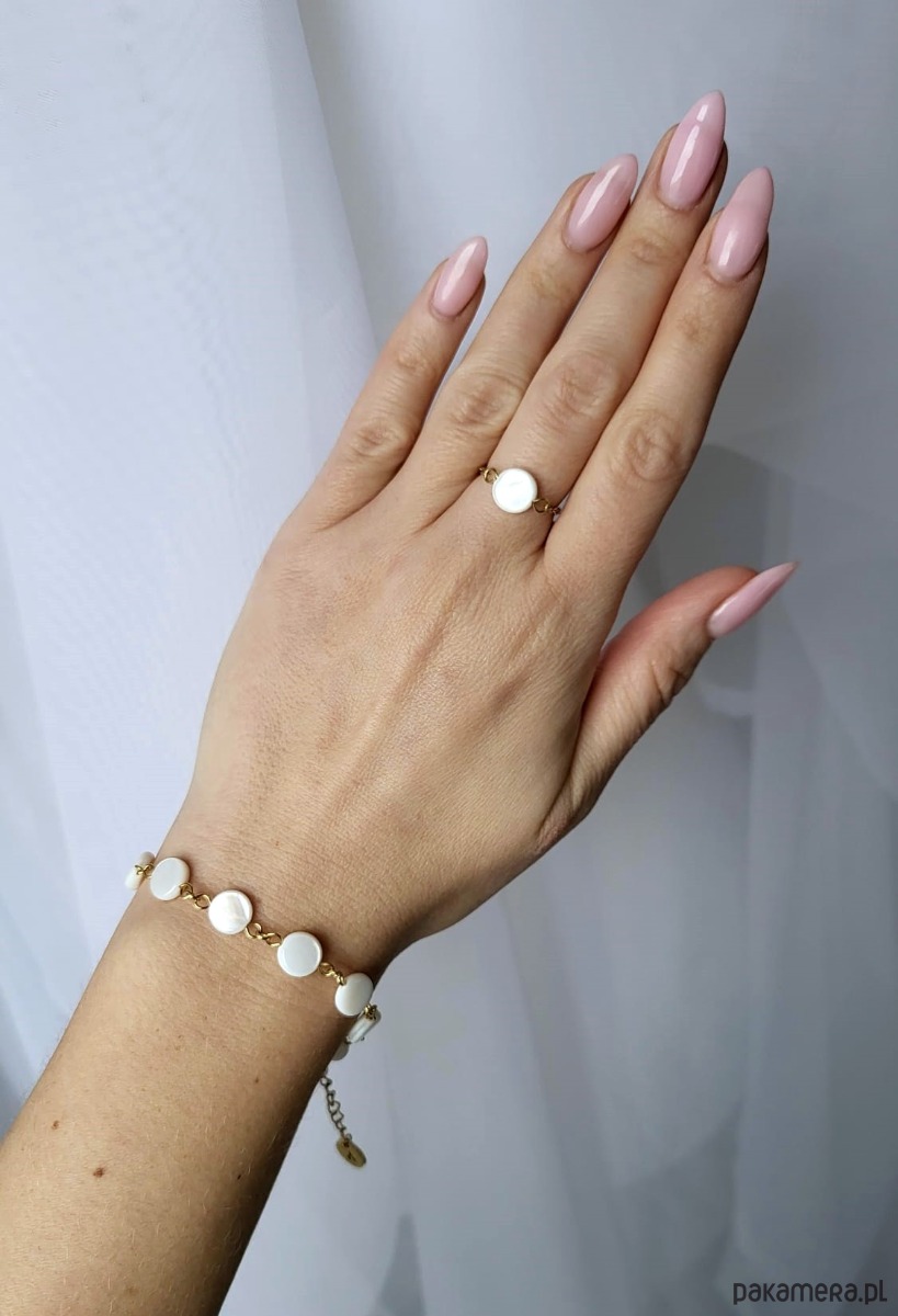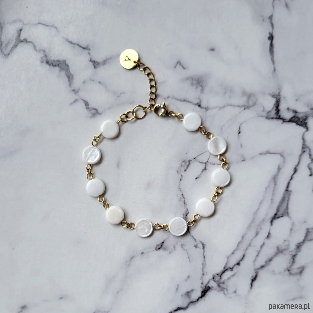 Bransoletka z pastylek masy perłowej w odcieniu bieli, wykonana ze stali szlachetnej oraz dodatkowo z kółeczek z mosiądzu pozłacanego 14k złotem. Zapinana jest na karabińczyk, z możliwością regulacji dzięki dodatkowej przedłużce (+ 5 cm), z logo Afroditte na jej końcu. Piękny odcień bieli sprawia, że bransoletka prezentuje się elegancko i z klasą. Jednocześnie wzór ten doskonale pasuje również do stylizacji boho.