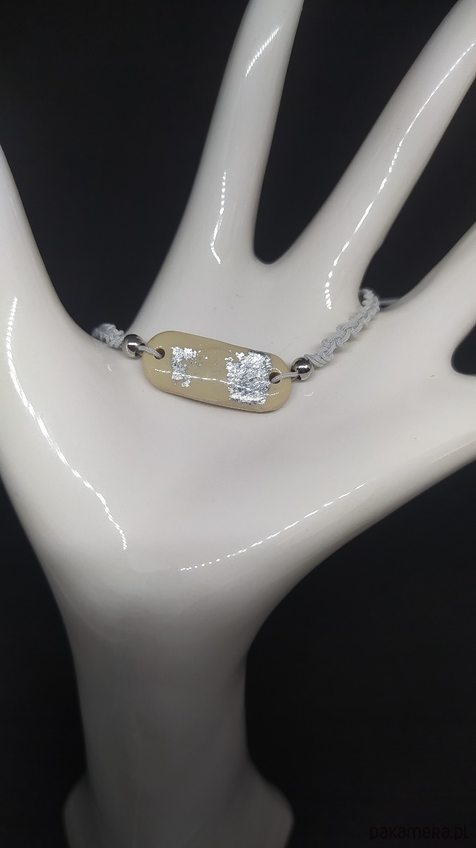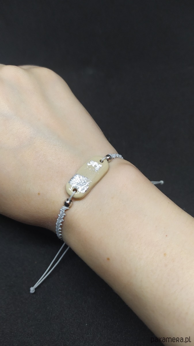Bransoletka wykonana ze sznurka poliestrowego i zawieszki wykonanej z glinki polimerowej.
